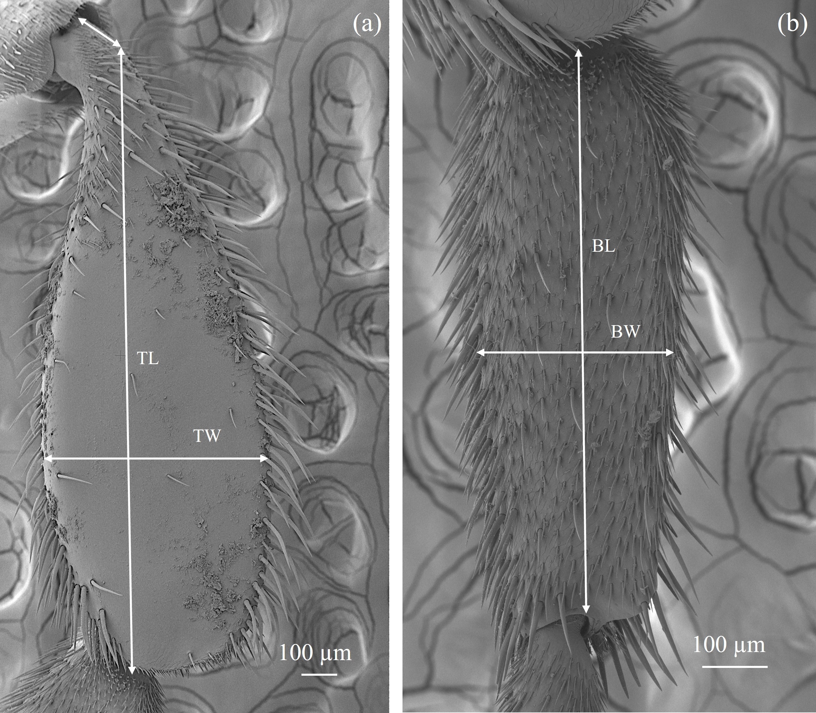 (a) TL: Tibia length and TB: Tibia breadth. (b) BL: Basitarsus length and BW: Basitarsus breadth. Tibia and basitarsus are of Lestrimelitta sp.