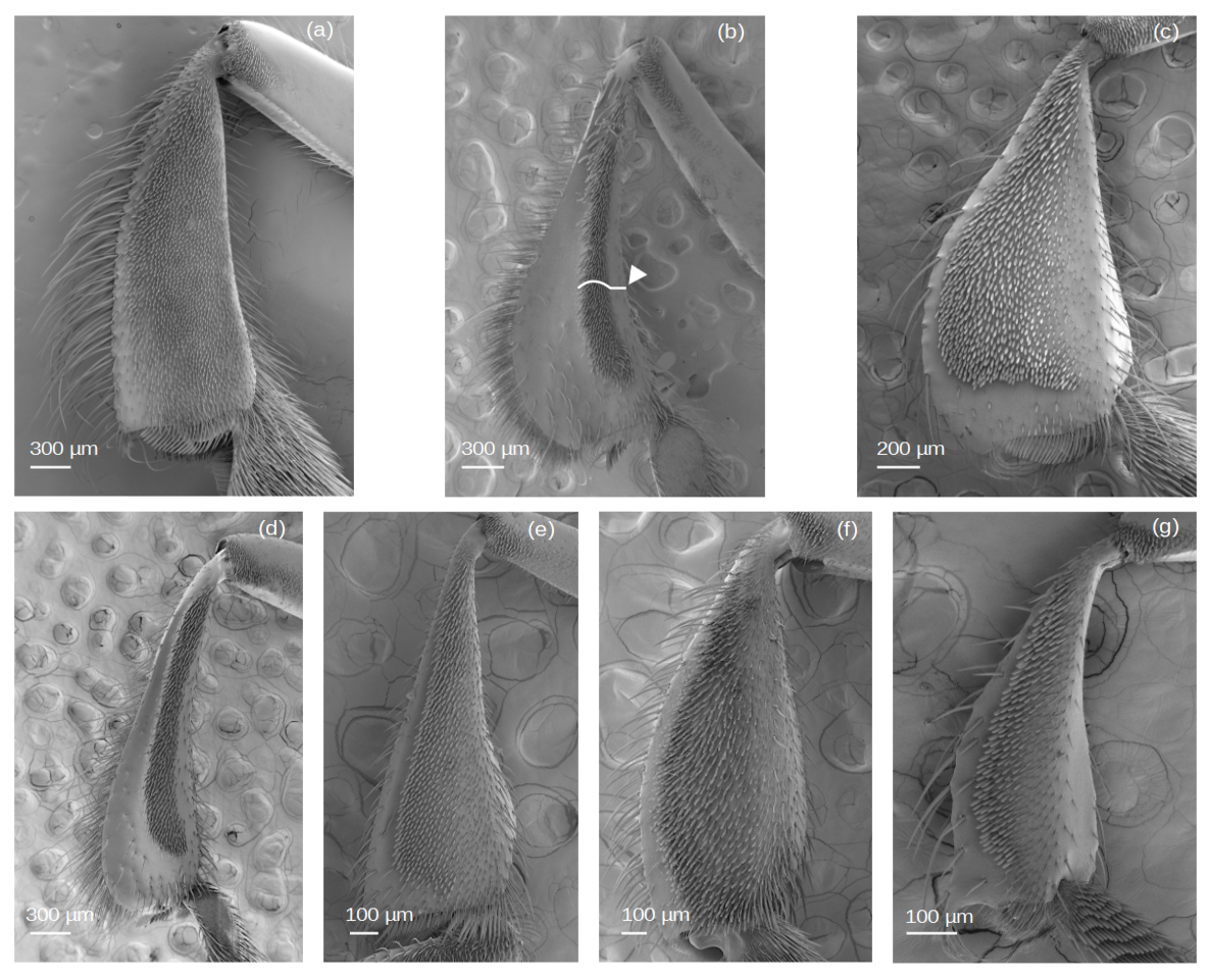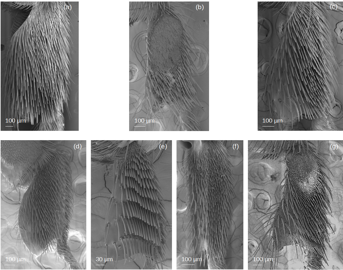 Marconi M, Vecco-Giove CD, Ormeño Luna J, Cerna Mendoza A, Mancini E, Di Giulio A. 2025. Scanning electron microscopy (SEM) reveals high diversity of setae on the hind tibiae and basitarsi of Peruvian Stingless Bees (Apidae: Meliponini) PeerJ 13:e19749