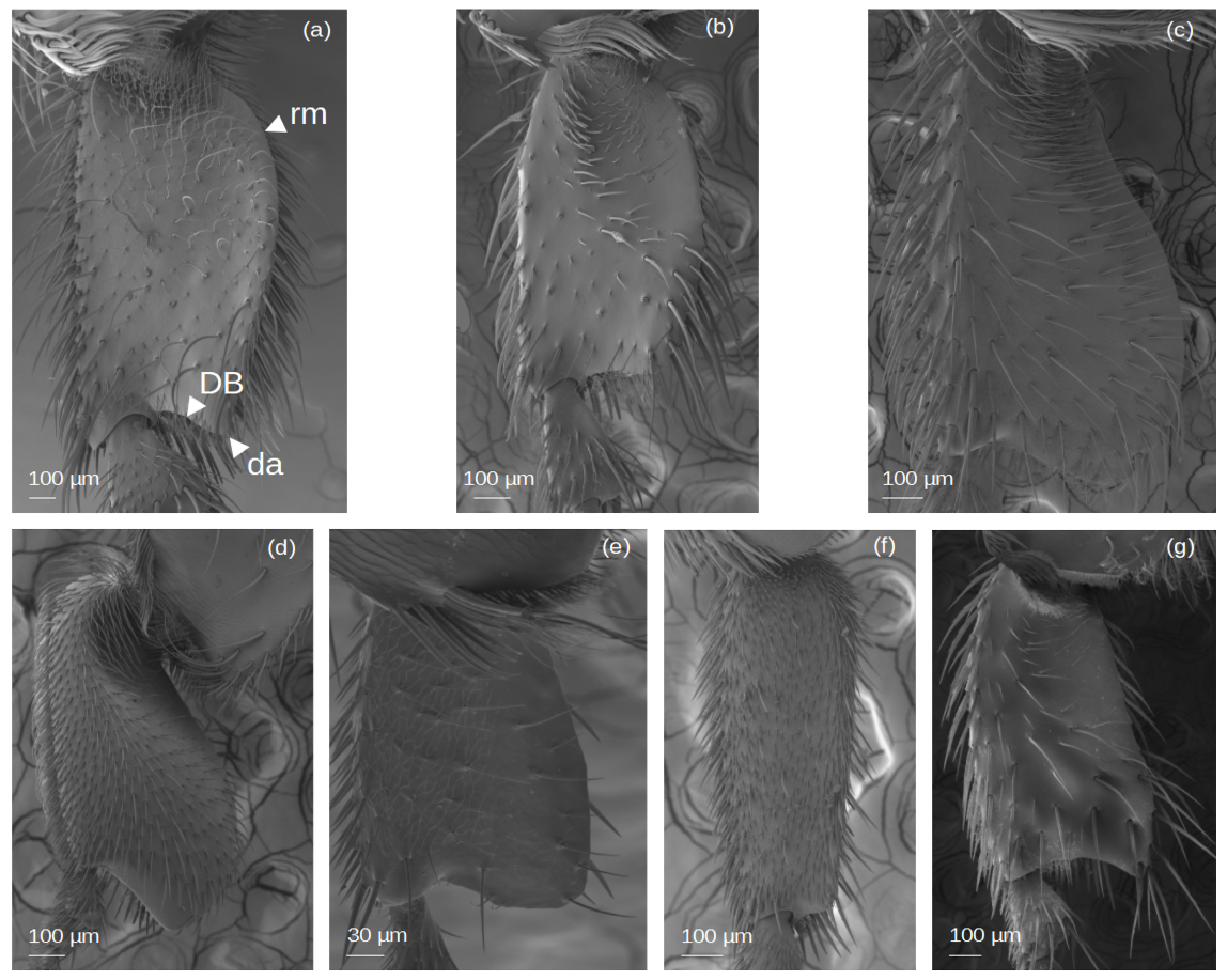 Variation among species was found in basitarsal morphology (Figs. S4S5), length and breadth (Table S1), the shape of the retrodorsal (rm) and distal margins (DB), the distal angle (da) and the sculpturing of the cuticle (Table S3).