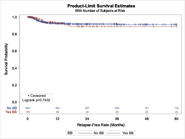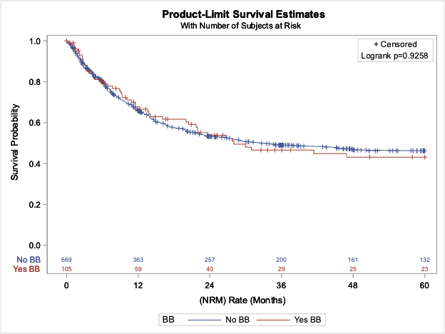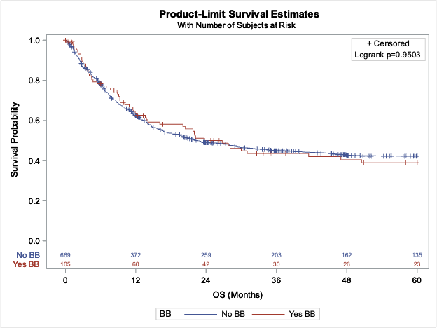 Demographics were compared between patients who were on a BB before and after allo-HCT (Yes BB) (n = 105) and those who were not (No BB) (n = 669). The Yes BB group had a greater proportion of participants with an HCT-CI of 4 or greater (p = 0.010). However, there were no significant differences between the two cohorts by race, sex, median age, conditioning regimen, or donor type (all p > 0.05) (Table 1).