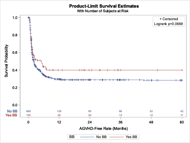 Our study found an association with decreased incidence of aGVHD in allo-HCT patients that had peri-transplant BB exposure on univariate analysis (p = 0.036); though this association did not remain significant on multivariate analysis (p = 0.150), suggesting that other factors may contribute to this trend, or that covariates may have overshadowed the BB effect. Therefore, we are hesitant to fully support a role for BBs as a prophylactic intervention to prevent aGVHD. One clinical study evaluated the risk of developing cGVHD for patients on a non-selective BB during the time of allo-HCT. While their results trended towards significance, that BBs were protective against cGVHD, they lacked sufficient power to detect a definitive difference. In our study, we found no association between BB and cGVHD occurrence (p = 0.947) or severity (p = 0.988). However, it is possible that a few days of peri-transplant BB exposure was insufficient to exert a lasting impact on this long-term outcome, given the median time to onset of cGVHD was 244 days (approximately 7.7 months) in our cohort. Future studies should include BB dosage and duration to better examine the impact of BB intake on long-term outcome evaluation of survival outcomes, including cGVHD.