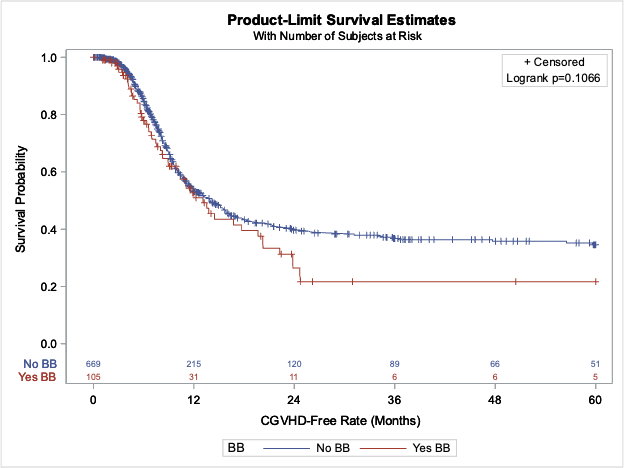 Several limitations of our study must be acknowledged. Our study is limited by the retrospective nature of the data collection. There are also underlying differences between the Yes BB and No BB groups, especially since the reasoning for being on a BB prior to allo-HCT is generally a co-morbidity that would increase HCT-CI and the potential risk of adverse events. While balanced in terms of demographics (except for HCT-CI), the Yes BB and No BB groups were unbalanced in terms of sample size, which could have contributed to the lack of statistical power to see a difference in additional outcome measures. While we attempted to control for confounding variables through multivariate analysis, residual confounding cannot be entirely excluded. Another limitation is the change in the use of cyclophosphamide during our cohort, where GVHD outcomes drastically improved, which could diminish the overall power we are able to detect. Lastly, the limited sample sizes in our subgroup analysis reduced the statistical power to detect differences, underscoring the need for larger prospective or randomized studies to strength any inference.