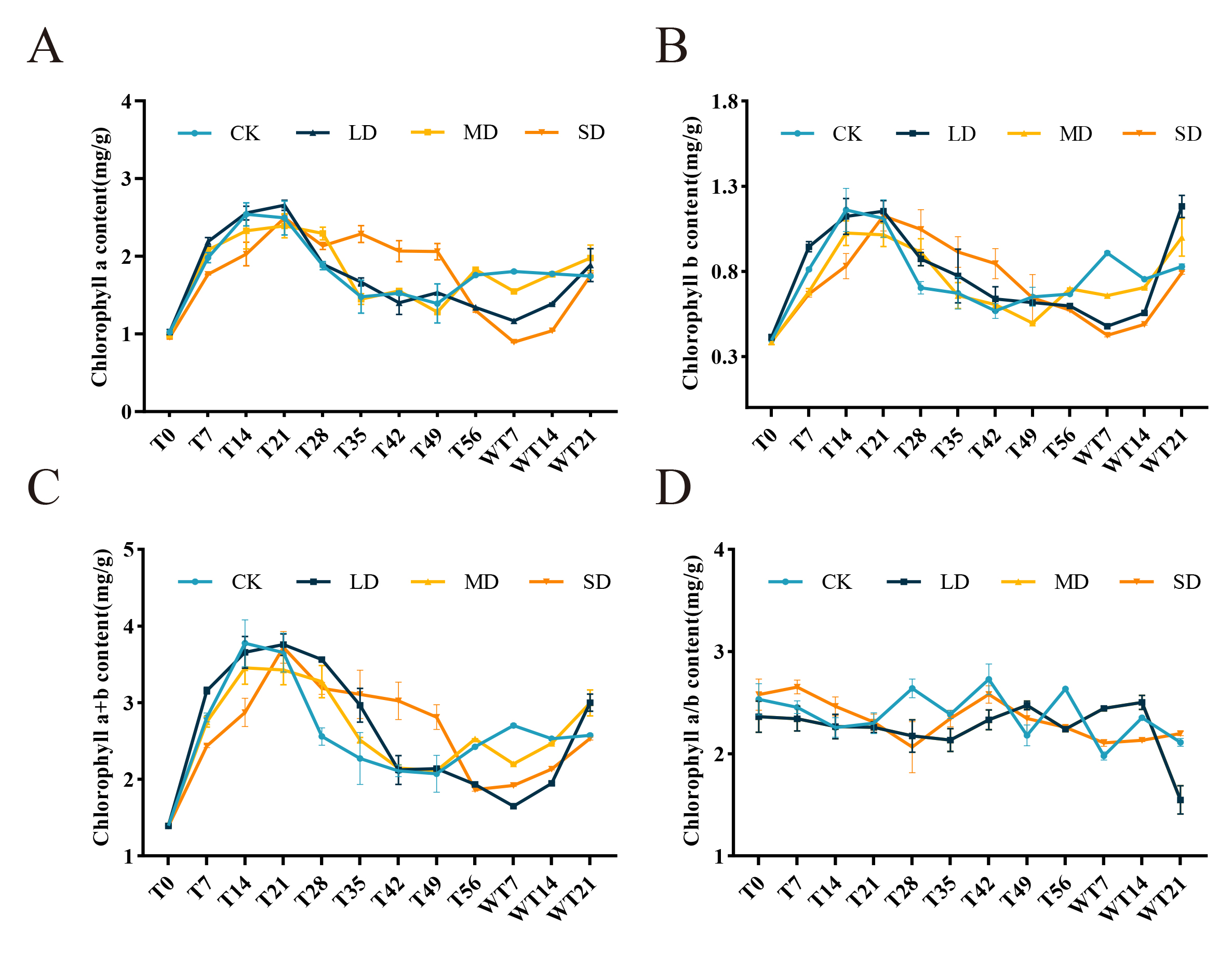 Under SD stress, the chlorophyll a/b ratio continued to decline until the 28th day. Under MD stress, the chlorophyll a/b ratio was relatively stable and reached the minimum on the 35th day. In contrast, under LD stress, the chlorophyll a/b ratio continued to rise until the 49th day, reaching a maximum of 2.47 mg/g (Fig. S1C). The chlorophyll a+b showed an upward trend on the 21st day of drought stress, followed by a decline until the 56th day. After rewatering treatment, the chlorophyll a+b increased again and exceeded the levels in the CK group (Fig. S1).