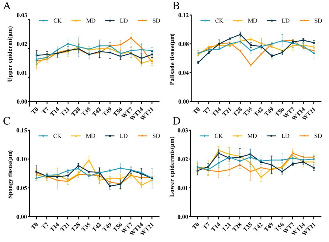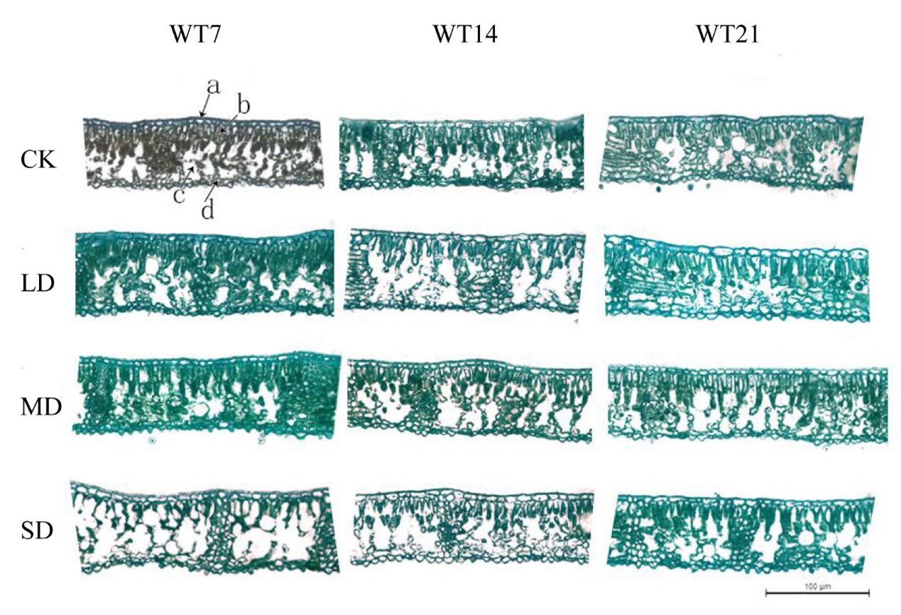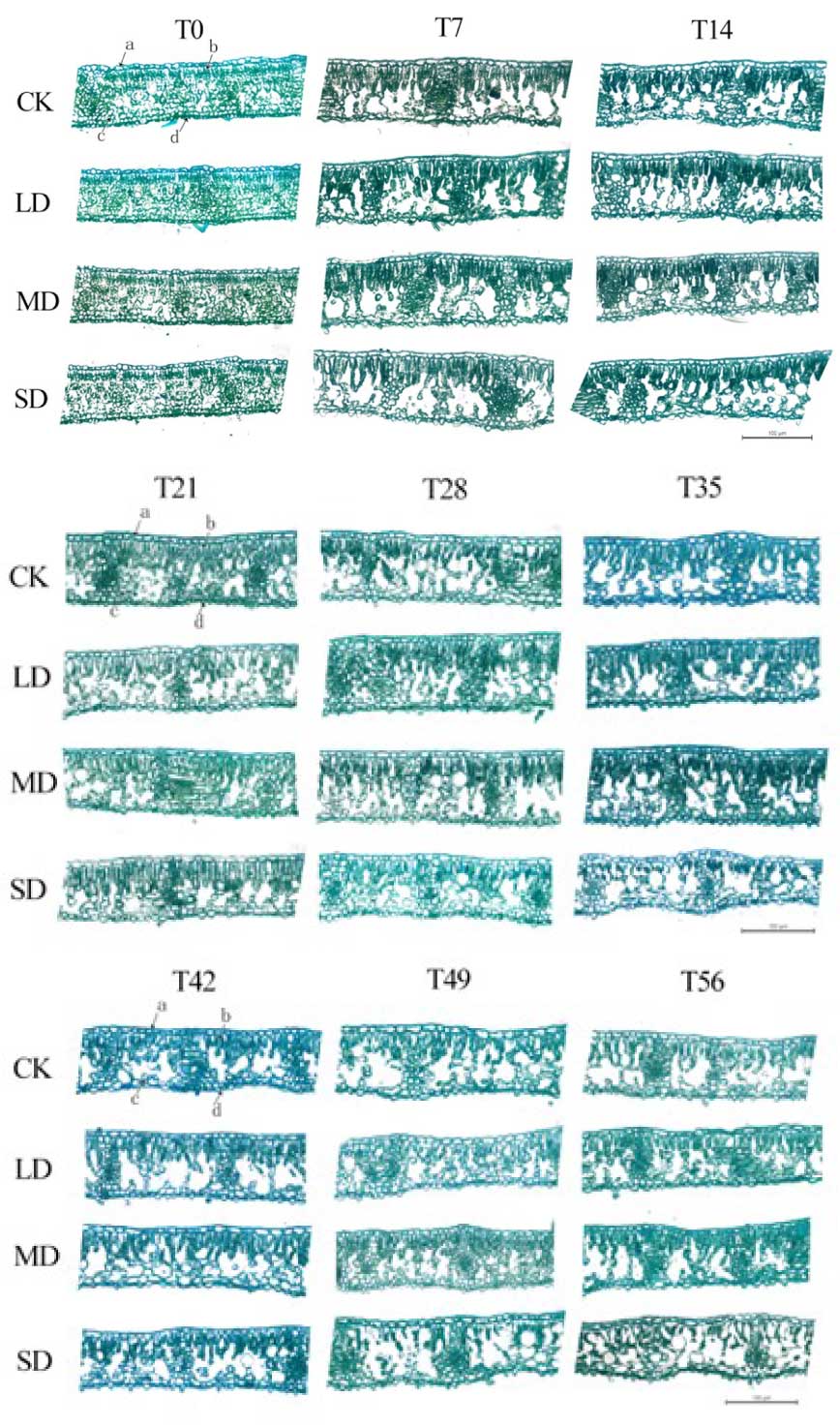 Different degrees of drought stress (CK; LD; MD; SD) on anatomical structure of M. faberi at 0, 7, 14, 21, 28, 35, 42, 49, and 56 days and rewatering (WT7, WT14, WT21)