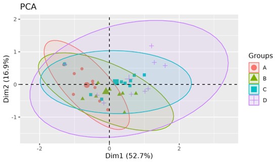 Principal component analysis revealed that the first principal component had a variance contribution rate of 52.7%, primarily contributed by plant height, Ci, and RC. The second principal component, with a variance contribution rate of 16.9%, was mainly contributed by POD activity, Tr, and photosynthetic rate. The cumulative contribution rate of these two principal components reached 69.4% (Fig. S5). The first principal component highlighted the significant role of chlorophyll b, chlorophyll a, chlorophyll a+b, Ci, plant height, and RC in reflecting the response of M. faberi leaves to drought stress. Overall, as drought stress increased from group A to group D, the relative aggregation of each treatment group gradually became more discrete, indicating a positive correlation between the degree of stress and the growth indices of M. faberi.