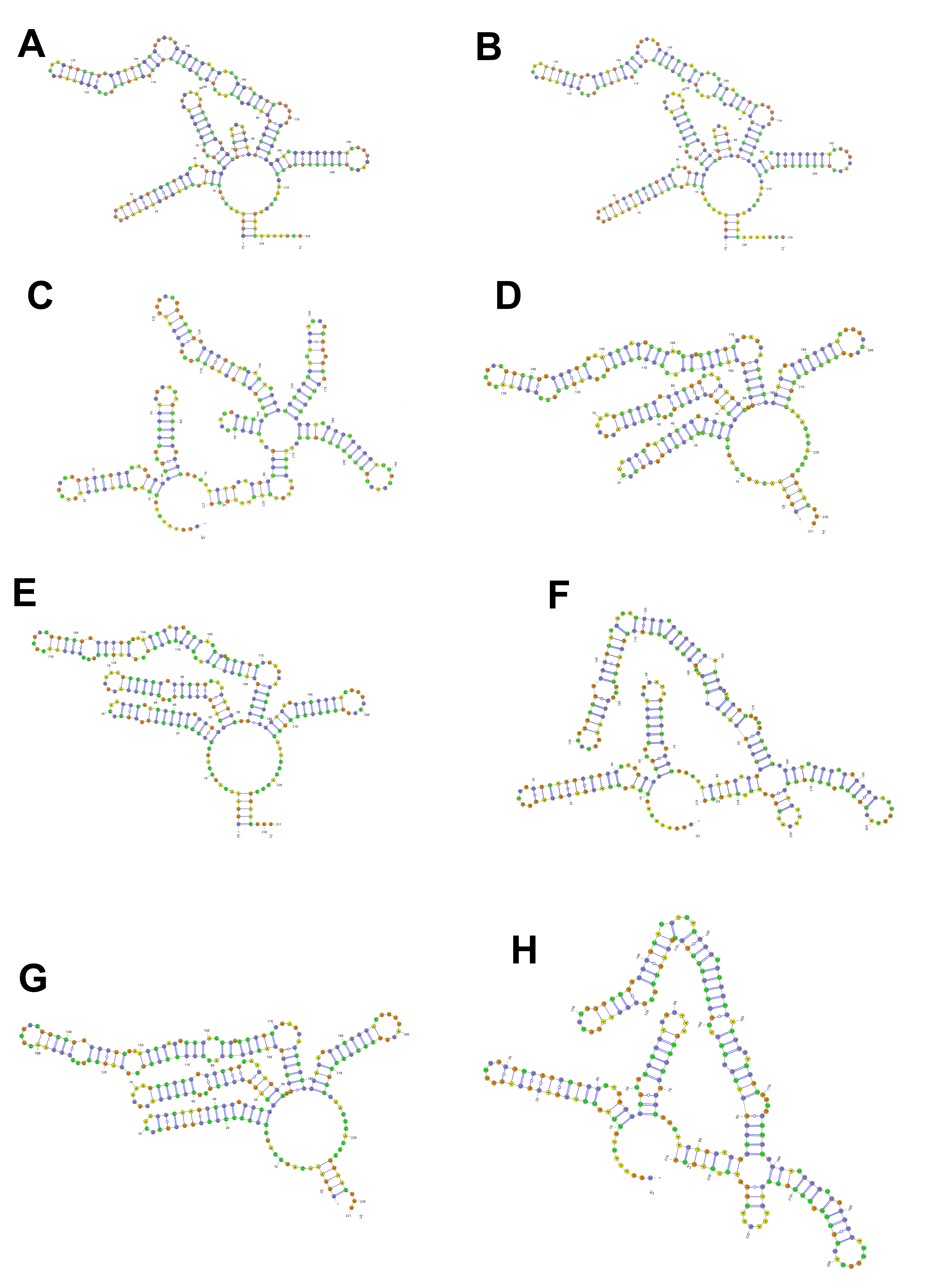 (A) ITS2 helix structures of Set_1, (B) ITS2 helix structures of Set_2, (C) ITS2 helix structures of Set_4, (D) ITS2 helix structures of Set_5, (E) ITS2 helix structures of Set_6, (F) ITS2 helix structures of Set_7, (G) ITS2 helix structures of Set_8, (H) ITS2 helix structures of Set_9.
