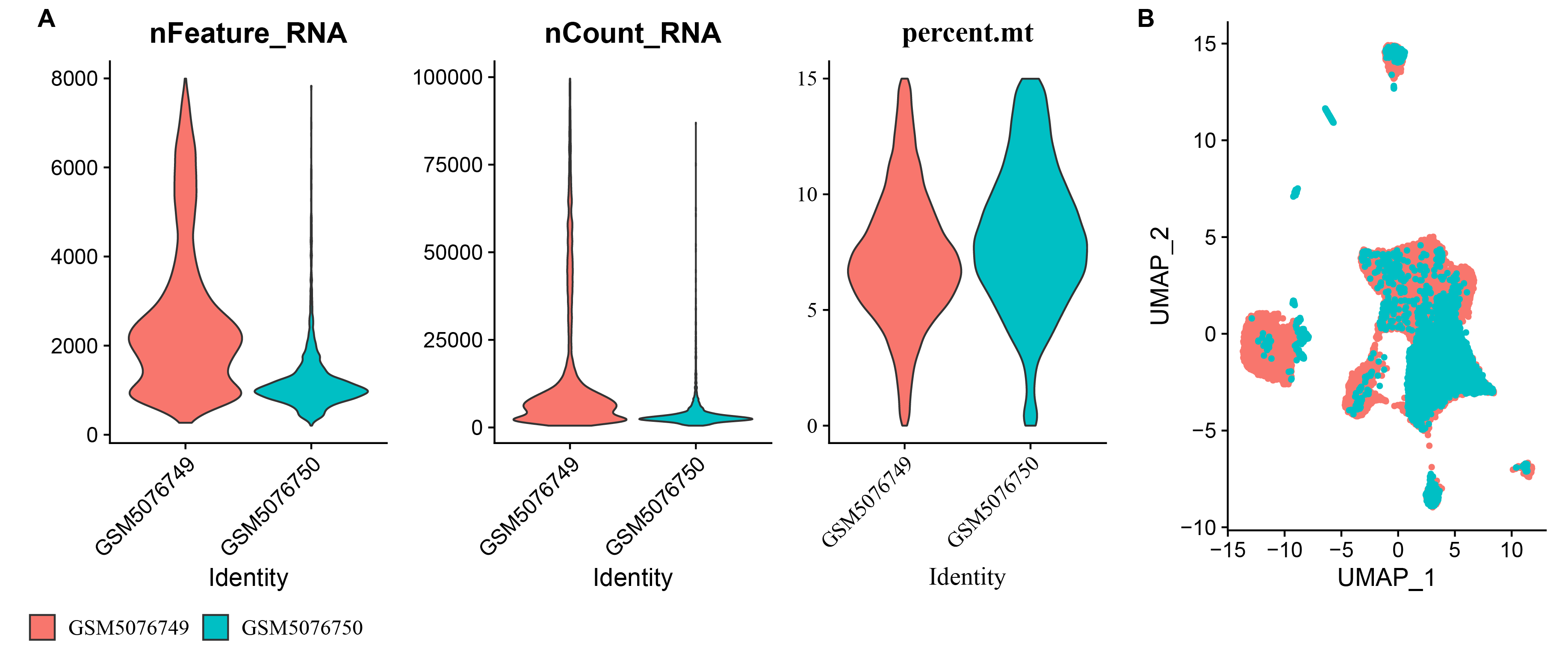 A: nFeature_RNA, nCount_RNA, and percent.mt in GSM5076749 and GSM5076750; B: UMAP plots of GSM5076749 and GSM5076750.