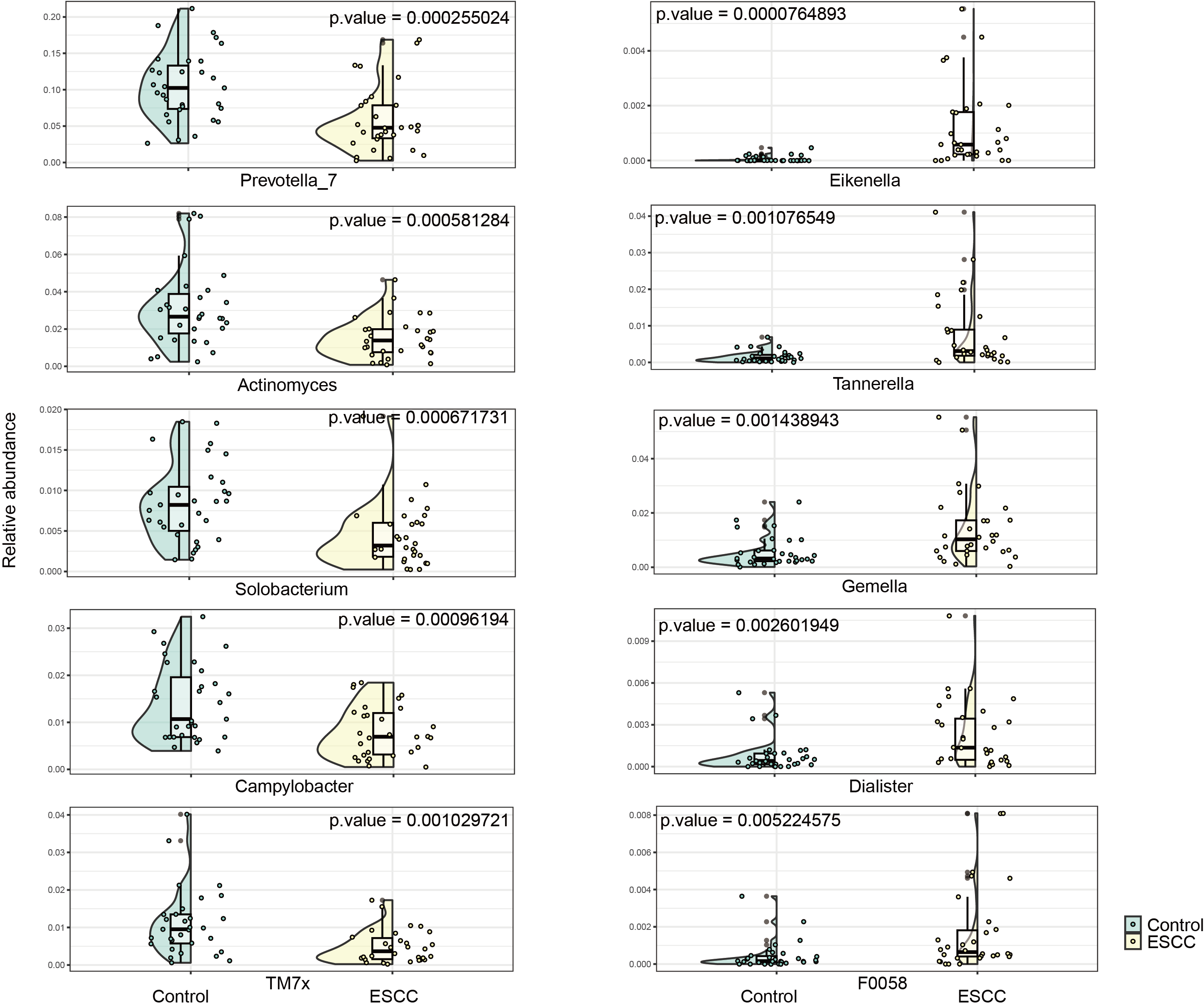 Streptococcus and Neisseria dominated the oral microbiota in both groups. At the genus level, significant compositional differences emerged: Moraxella displayed higher relative abundance in controls (p < 0.001), whereas ESCC samples showed marked enrichment of Gemella (p = 0.0003) and Corynebacterium (p < 0.00001). Conversely, Prevotella_7 was significantly reduced in ESCC patients compared to controls (p = 0.0002) (Fig. 2). The ten microbial genera with the most significant statistical differences are presented in the appendix figure. Among them, five are significantly more abundant in ESCC compared to the control group (Eikenella, Gemella, Dialiste r, F0058), and five are less abundant than the control group (Prevotella_7, Actinomyces, Solobacterium, Campylobacter, TM7x).