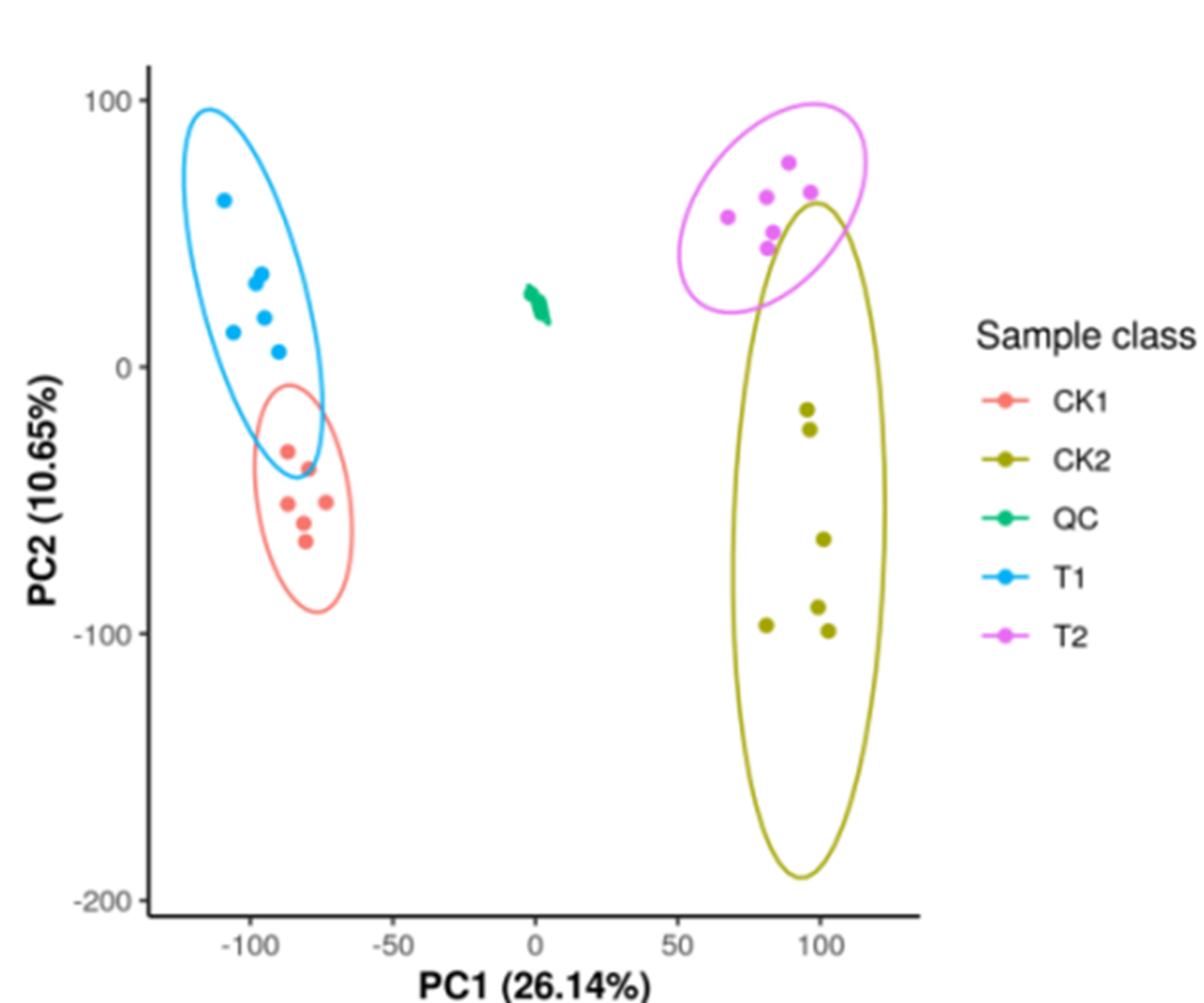 Each group had six biological replicates with high consistency to ensure data reliability. Quality control analyses were conducted before the study to ensure the reliability of the detection results and good intra-treatment replicability (Fig. S1). PCA results revealed significant separation of T1 and CK1 samples (Fig. 2A) and T2 and CK2 samples (Fig. 2B), indicating significant differences between treatments. These results highlighted the significant metabolic profile differences between T1 and CK1, and between T2 and CK2.