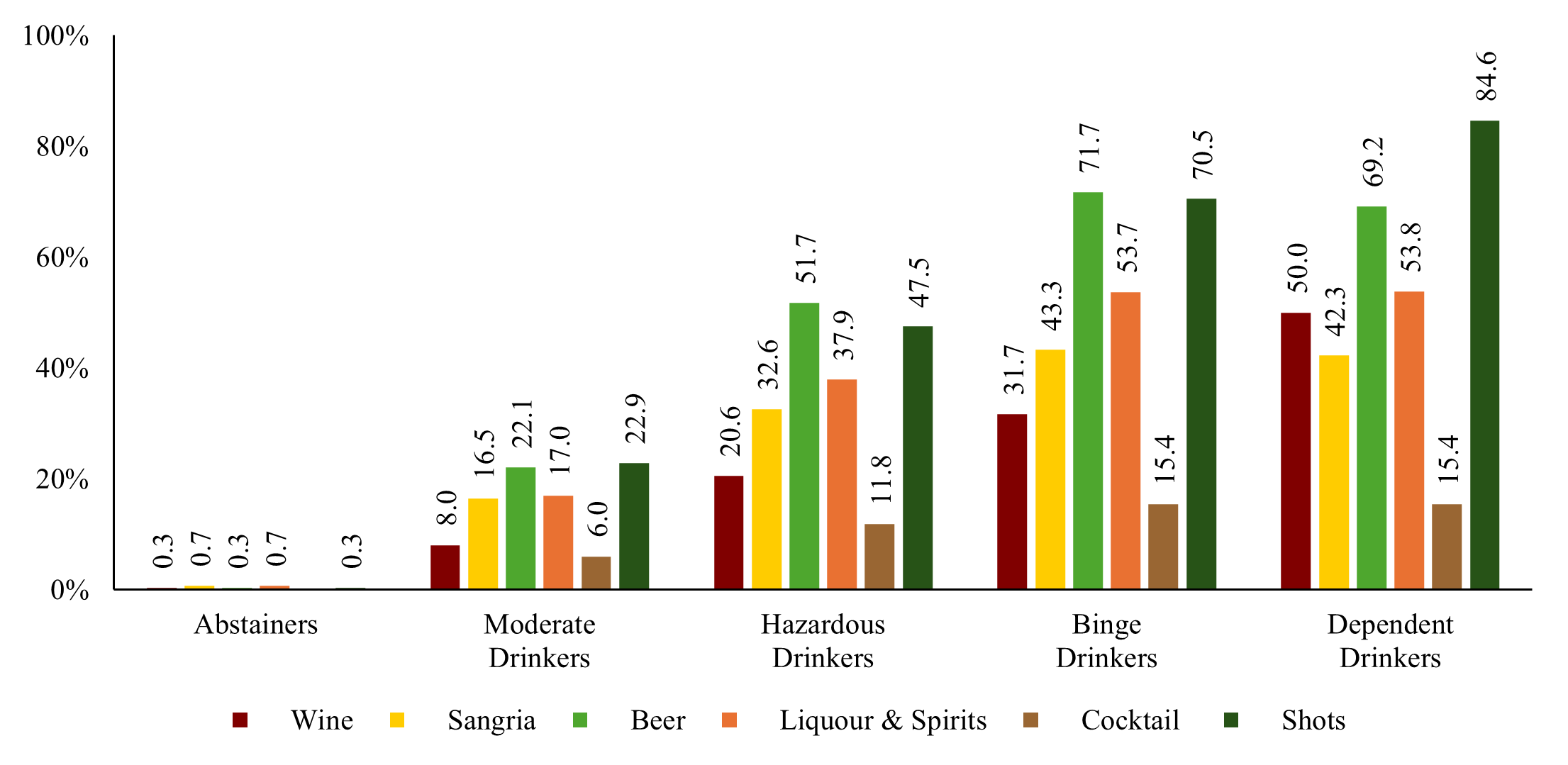 The most commonly consumed alcoholic beverages among students were beer (36.9%) and shots (36.3%). Although the proportions of alcohol types consumed varied across drinking groups, beer and shots remained the most frequently consumed drinks for all groups (see Fig. S2). Moderate and Hazardous Drinkers displayed similar patterns, with Moderate Drinkers reporting nearly equal consumption of beer (22.1%) and shots (22.9%), while Hazardous Drinkers showed slightly higher consumption of beer (51.7%) than shots (47.5%). In contrast, Binge Drinkers and Dependent Drinkers exhibited high levels of consumption across all types of alcohol, with Binge Drinkers reporting the highest beer consumption (71.1%) and Dependent Drinkers the highest consumption of shots (84.6%).
