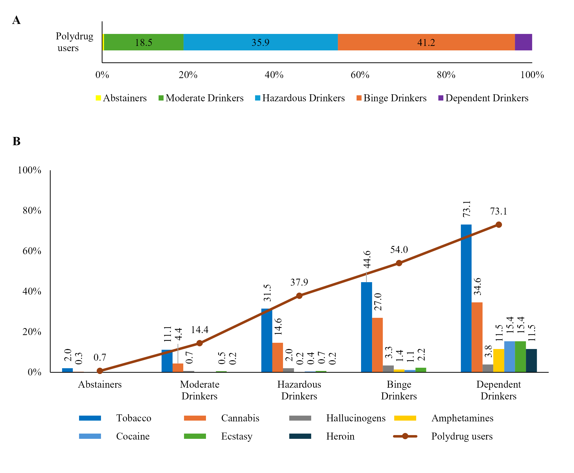 (B) Prevalence of single-substance and polydrug use across the Drinking Groups; Grouped bar showing the percentage of use, within Drinking Groups, for tobacco, cannabis, cocaine, ecstasy, hallucinogens, amphetamines, and heroin. The overlaid line indicates the percentage of polydrug use across the Drinking Groups.