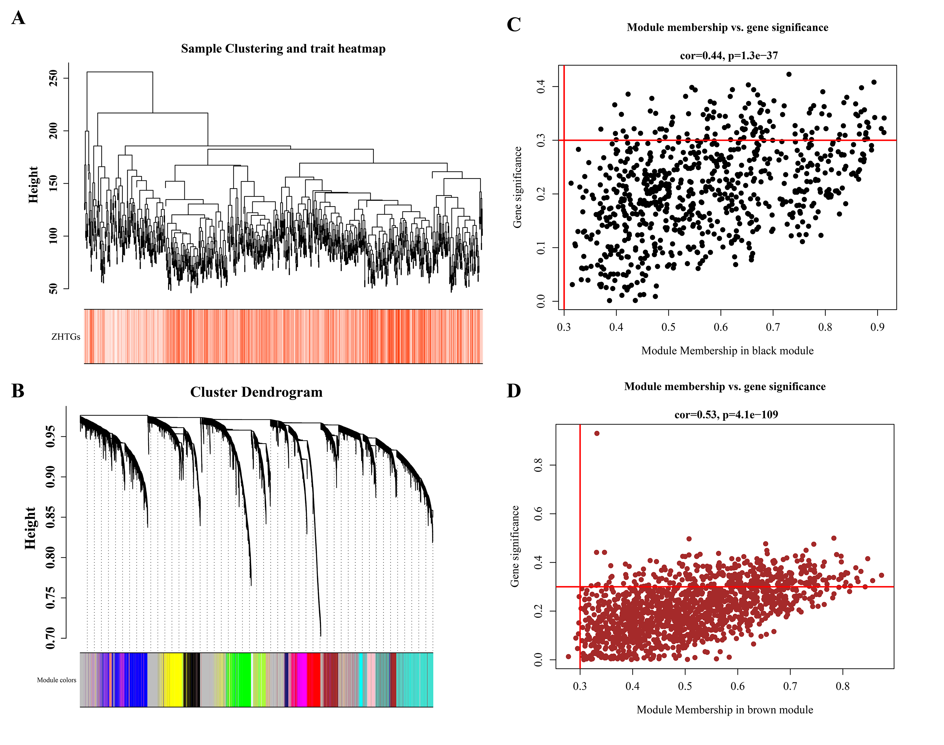 (A) Sample clustering and trait heatmap shows that there are no obvious outliers specimens. (B) The genes were divided into 16 modules by co-expression network, and the p-value and correlation coefficient of each module were clearly marked. (C) The key module genes were screened by GS and MM modules. The black module retains 130 genes, and the brown module retains 313 genes.