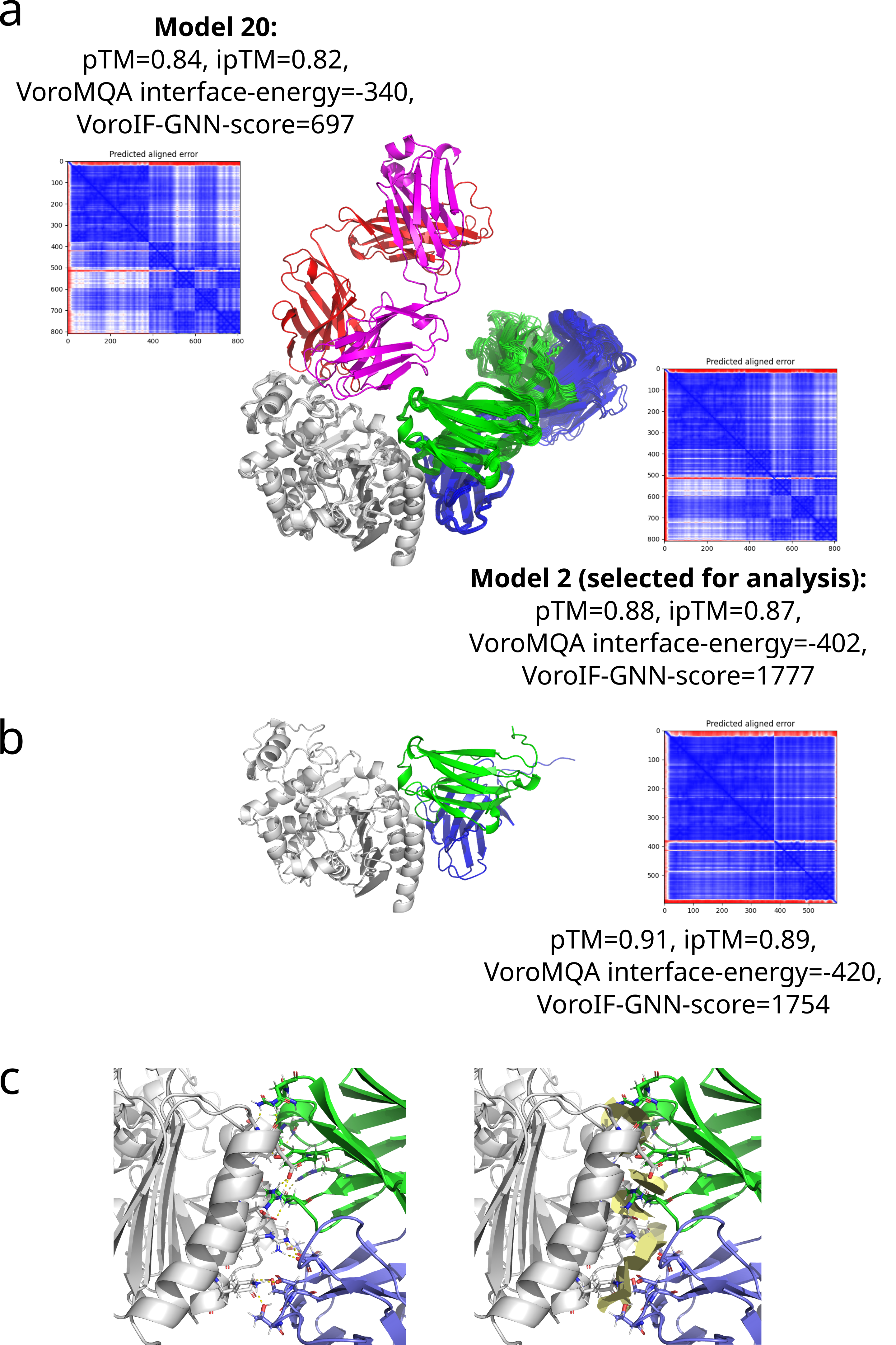 (a) 20 most reliable models that were selected according to AlphaFold accuracy self-estimates and their accuracy measures. CMY-34 is colored gray, Fab fragments in selected 19 of 20 most reliable models are colored green (heavy chain) and blue (light chain), Fab fragment in the remaining 20 th model is colored red (heavy chain) and magenta (light chain). (b) Top ranked AFsample model of the CMY-34-MAb 2E11 VH and VL interaction. (c) Hydrogen bonds at the predicted CMY-34-MAb 2E11 interface. Picture on the left demonstrates the distance-based visualization, picture on the right shows the contact areas.