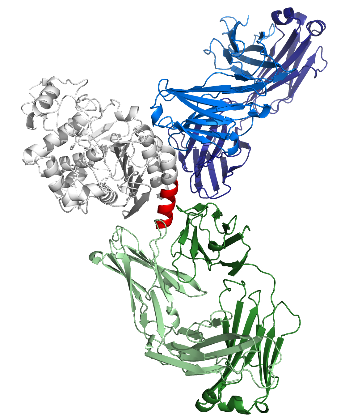 According to computational structure prediction, MAbs 2E11 (blue) and 9D2 (green) bind to different epitopes of CMY-34 (grey). Experimentally determined epitope of the MAb 9D2 is colored red.