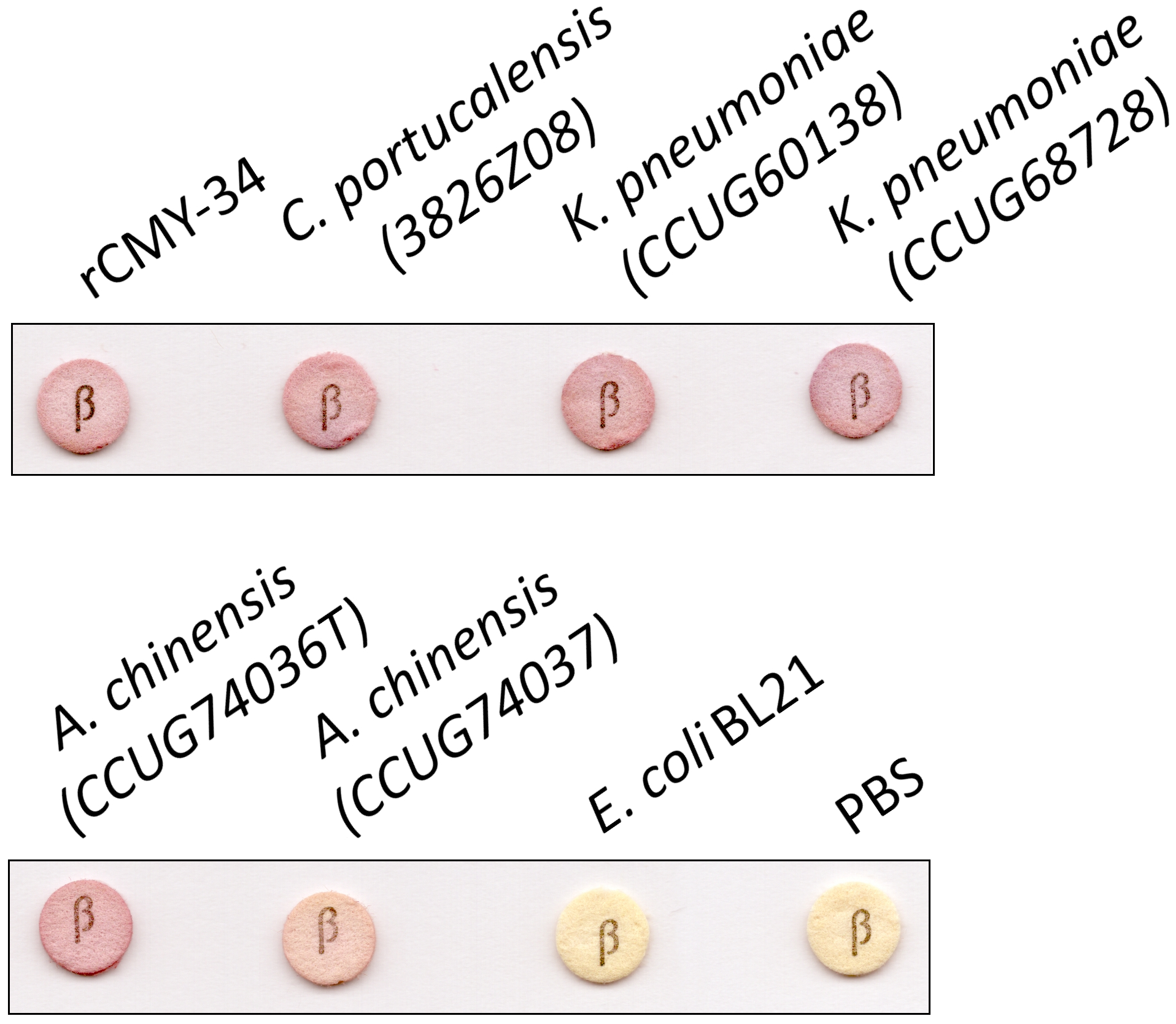 Purified rCMY-34 and prepared lysates of C. portucalensis (3826Z08, CMY-34 producer), K. pneumoniae (CCUG60138 and CCUG68728, CMY-4 and NDM-1 producers) and A. chinensis (CCUG74036T and CCUG74037, NDM-1 producers) isolates were analyzed. E. coli BL21 lysate and protein dilution buffer (PBS) were tested as negative control. Red color indicates an enzymatic activity of β-lactamases (nitrocefin hydrolysis) and yellow color indicates no enzymatic activity.