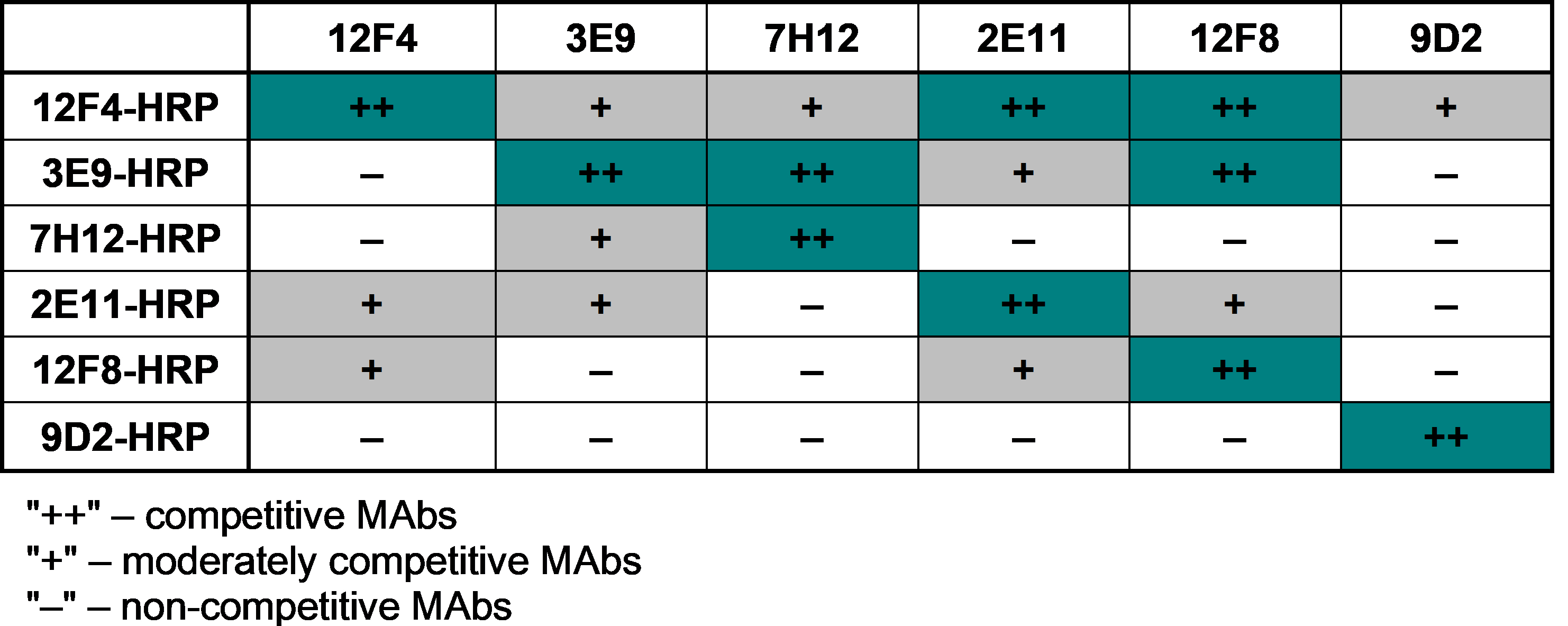 Competitive ELISA was used for selection of non-competing pairs of MAbs, suitable for sandwich-type immunoassays. For the method, antigen coating, blocking, washing and other procedures were carried out as described above, in the protocol of indirect ELISA. After blocking step, the plates were incubated with 50 µL/well of MAbs at concentration of 10 µg/mL for 1 h at RT. Then, HRP-conjugated MAbs (50 µL/well) were added, and the plates were incubated for 1 h at RT.
