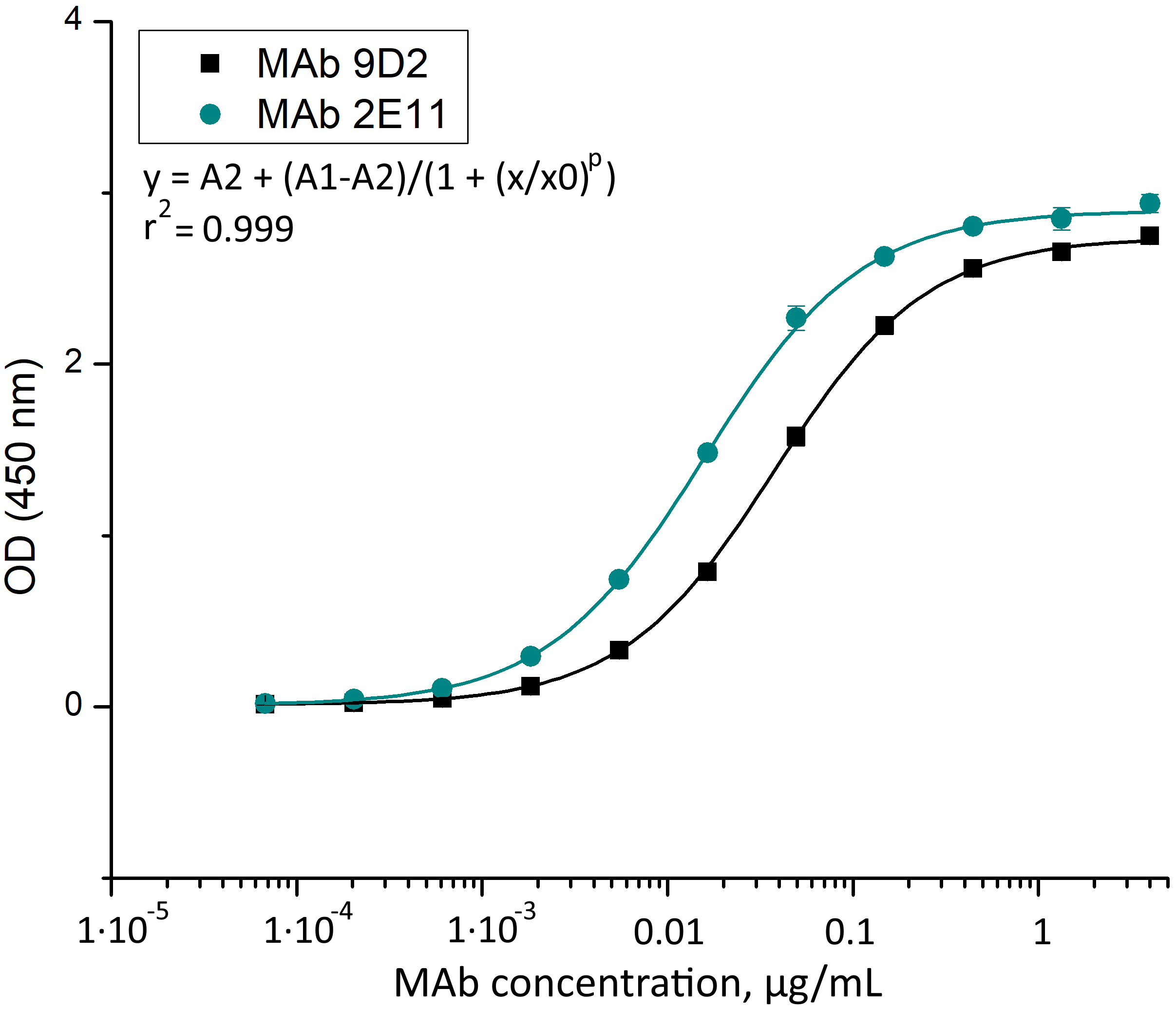 Indirect ELISA was used for testing of blood samples of immunized mice, selection of antigen-specific MAb producing hybridoma cells, cross-reactivity testing and determination of apparent dissociation constants (Kd). A total of 96-well plates (10547781; Thermo Scientific, Waltham, MA, USA) were coated with 50 µL/well of antigen at 3–5 µg/mL concentration in coating buffer (50 mM sodium carbonate, pH 9.5) for 16 h at 4 °C, and blocked with 250 µL/well of 2% bovine serum albumin (BSA) (w/v) in PBS for 1 h at room temperature (RT). After blocking, the wells were incubated with mouse blood samples (dilution ranging from 1:300 to 1:656,100 in phosphate–buffered saline containing 0.1% Tween-20 (v/v) (PBST)) or with undiluted hybridoma cell culture supernatant. For Kd determination, MAbs in the concentration range of 32–0.005 nM in PBST were tested. After incubation, plates were washed five times with PBST, followed by incubation with 50 µL/well of secondary horseradish peroxidase (HRP)-conjugated goat anti-mouse IgG antibodies (1721011; Bio-Rad, Hercules, CA, USA) (dilution factor 1:5,000 in PBST) for 1 h at RT. Then, the plates were washed six times with PBST and incubated with 50 µL/well of 3,30,5,50-tetramethylbenzidine (TMB, Clinical Science Products, 01016-1-1000). The reaction was stopped with 25 µL/well of 1 N H2SO4 solution. The OD was measured with microplate spectrophotometer and calculated as difference between measured OD values at 450 nm and reference wavelength at 620 nm.