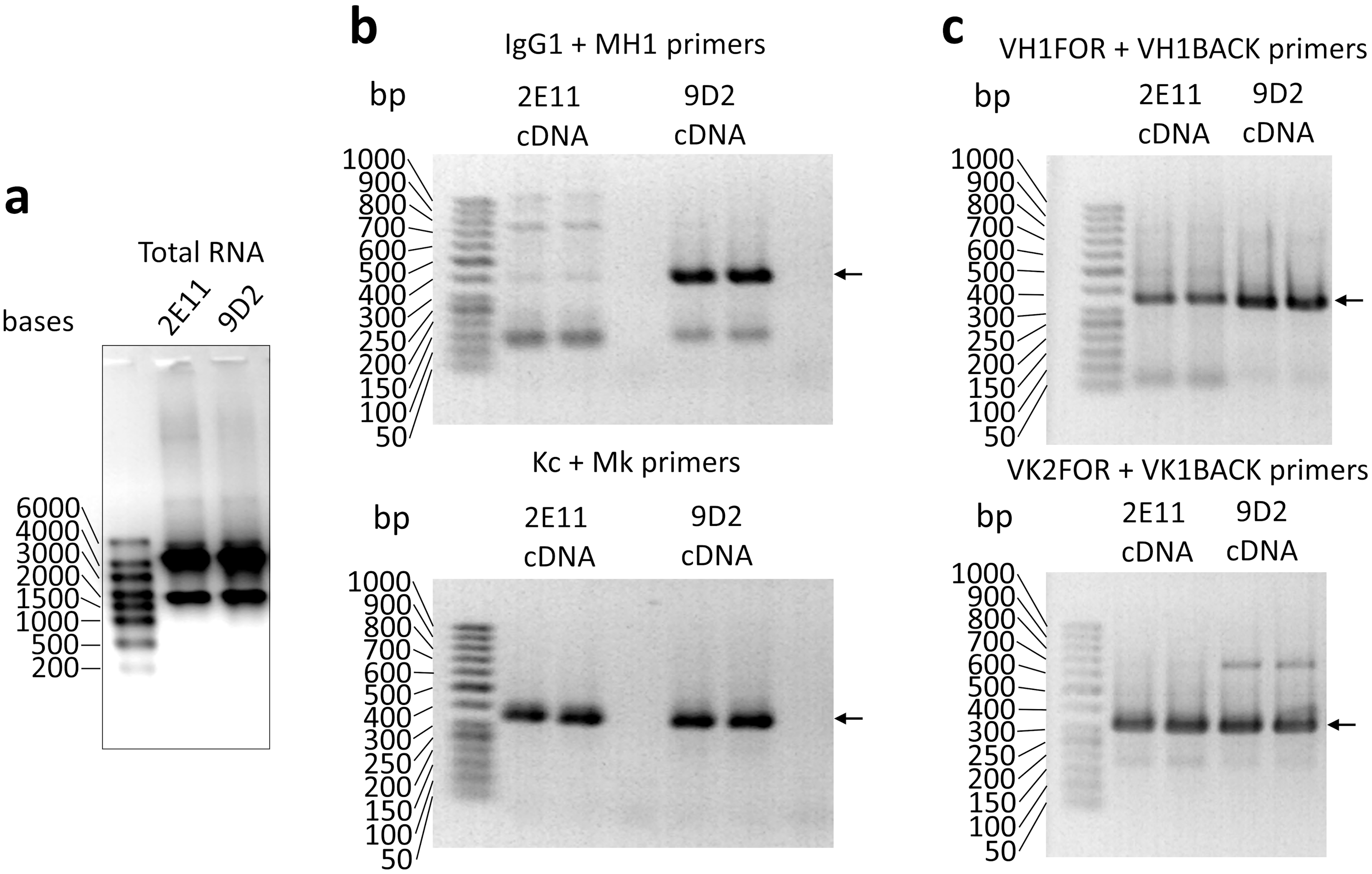 (a) Evaluation of isolated hybridoma total RNA by RNA electrophoresis. RNA samples were fractionated in 1 % agarose gel. M—RiboRuler High Range RNA Ladder (Thermo Scientific, SM1821). (b, c) Examples of amplified VH and VL coding sequences ( marked with arrows) using modified IgG1, MH1 and Kc, Mk pairs of primers (b), VH1FOR, VH1BACK and VK2FOR, VK1BACK pairs of primers (c). PCR products were fractionated in 2% agarose gel. M—GeneRuler 50 bp DNA Ladder (Thermo Scientific, SM0373).