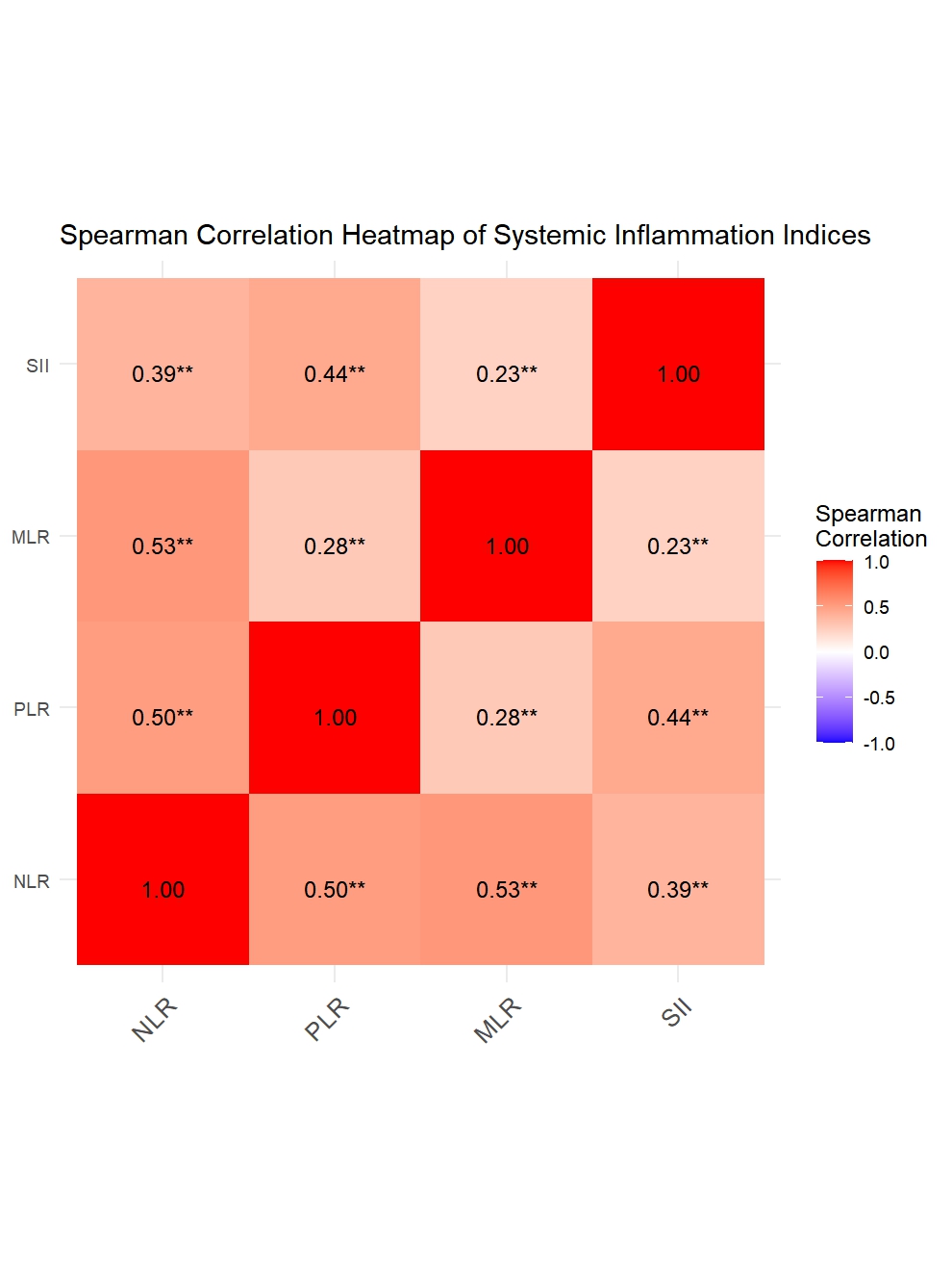 Each cell shows the Spearman rank-correlation coefficient (ρ) between two indices; deeper red indicates a stronger positive association (scale −1 to +1). Asterisks denote statistical significance (P < 0.01). Abbreviations: NLR, neutrophil-to-lymphocyte ratio; PLR, platelet-to-lymphocyte ratio; MLR, monocyte-to-lymphocyte ratio; SII, systemic immune-inflammation index.