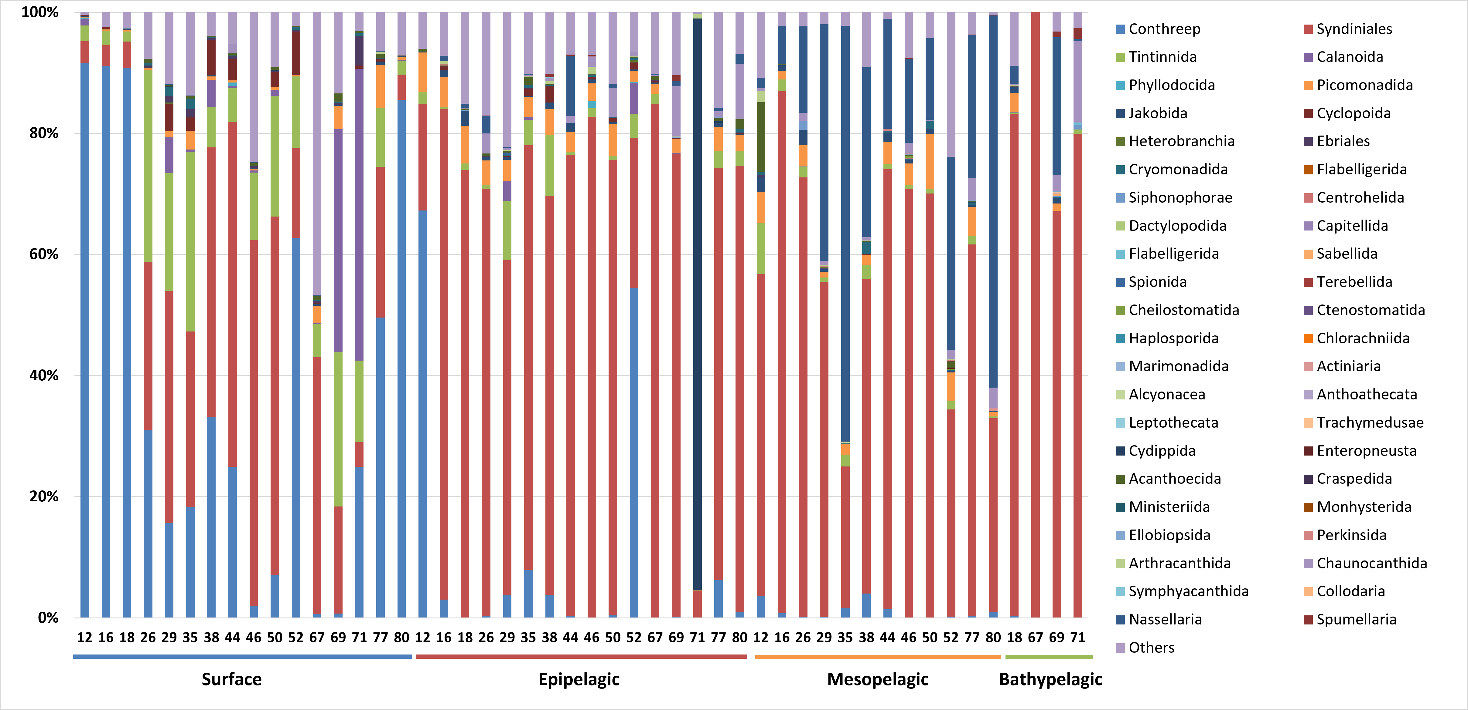 The taxonomic composition of zooplankton mainly focused on the phylum level categorized into four depth-based groups (Fig. 5). We primarily focused on the phylum level for taxonomic classification of zooplankton. However, due to the current limitations and structure of reference databases, some groups assigned at the subphylum or clade level, where formal phylum level classification is not yet established or remains under debate, were also included in the phylum level analysis. A total of 18 major taxonomic groups were identified in the zooplankton community. In the Surface group, Ciliophora and Protalveolata were dominant, with Ciliophora particularly abundant in coastal regions such as Stations 12, 16, 18, and 80. Notably, Arthropoda was more prevalent at specific stations, such as 69 and 71, compared to other regions. Picozoa was more abundant in open-sea regions, including Stations 46 and 67, than in coastal areas. In the Epipelagic group, Protalveolata was the most abundant taxon, with Retaria showing an increased proportion compared to the Surface group. Although Ciliophora was dominant in the Surface group, it remained abundant in specific regions of the Epipelagic group, particularly at Station 12 and 52. Interestingly, Ctenophora was dominant in Station 71, likely due to the local aggregation or movement of its population. In the Mesopelagic group, Protalveolata and Retaria remained highly abundant, similar to the Epipelagic group. Retaria was particularly prevalent in coastal regions such as Stations 35 and 80. Picozoa was relatively abundant in offshore regions, including Stations 44, 46, 50 and 52. In the Bathypelagic group, Protalveolata had the highest proportion among all samples, while Arthropoda was notably abundant at Station 18, the only coastal station in the Bathypelagic group. We also analyzed the taxonomic composition of zooplankton at the order level and detected 44 orders, which will be discussed in relation to the phylum-level taxa in the following discussion section.