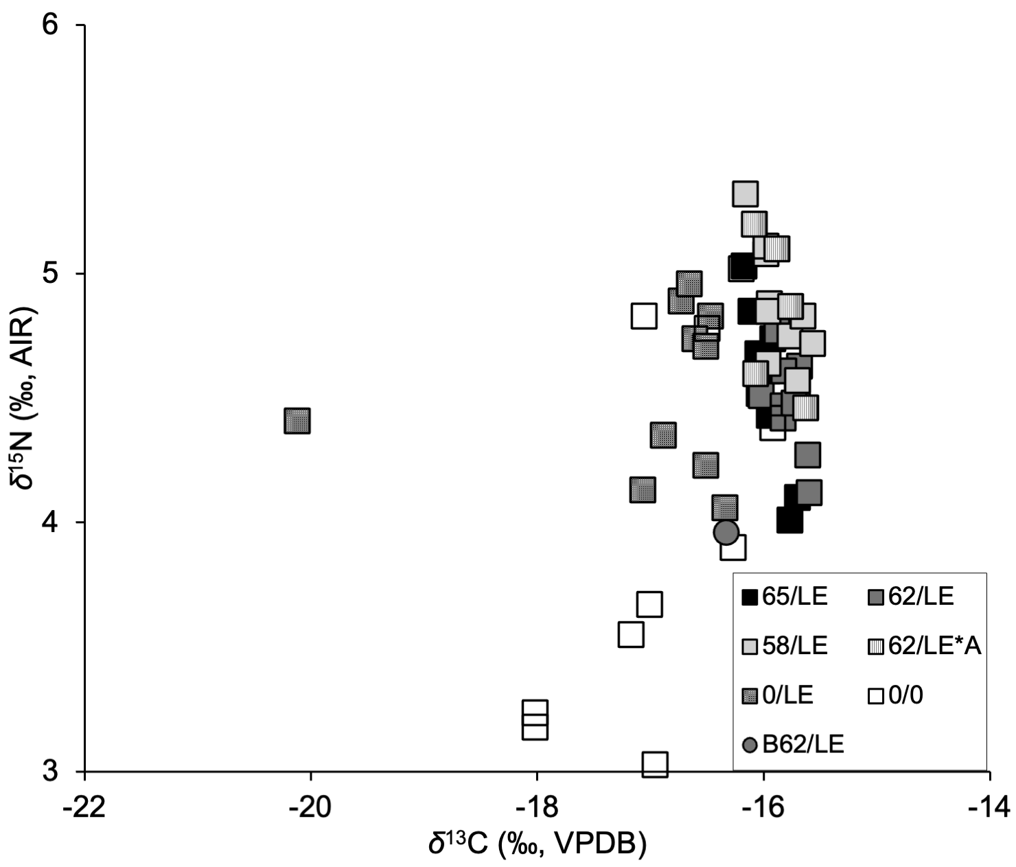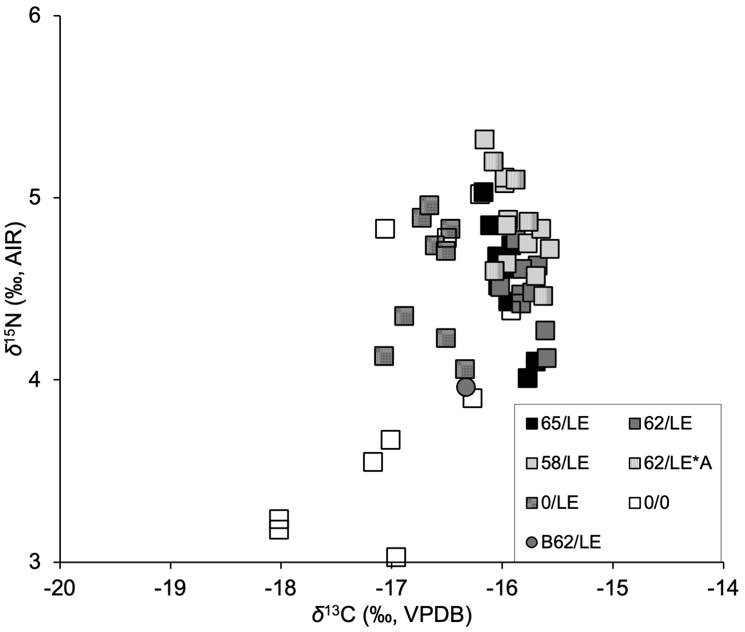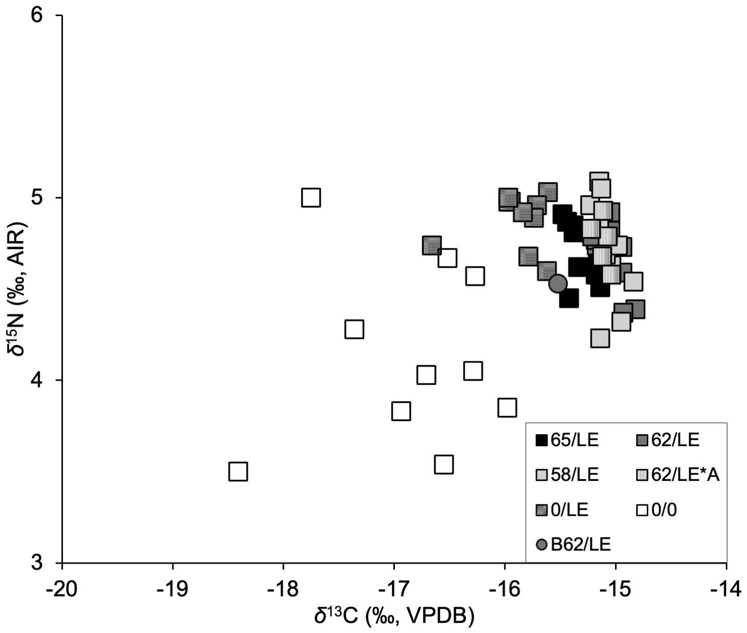 δ13C and δ15N values generated using 62/LE*A treatment did not differ significantly from other reflux treatments, but this treatment did differ significantly from the non-refluxed treatment (Tables S3 and S4). 62/LE*A displayed standard deviations of δ13C that were slightly higher than other reflux treatments, while the standard deviations of δ15N were greater than all other treatments in two individuals (Table S9). Similar trends were identified in wt% C and wt% N, with 62/LE*A displaying standard deviations higher than other treatments (Tables S7–S9). The C:NAtomic for 62/LE*A was also higher with more variability than other reflux treatments but was still lower than 0/LE.