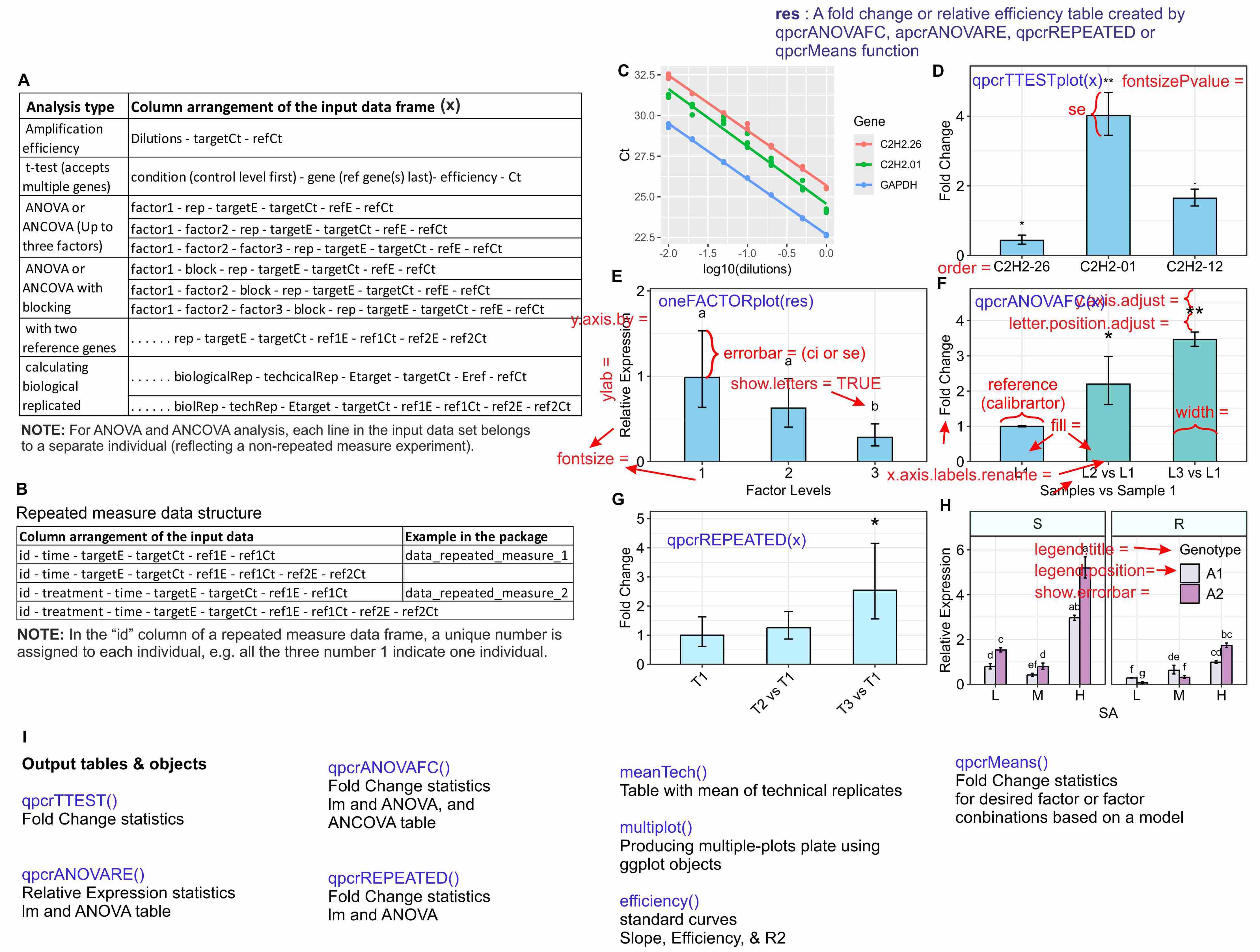 The used functions are presented in blue. (A) Standard curve and the amplification efficiency analysis of genes. (B) Average fold changes of three target genes relative to the control condition computed by unpaired t-tests via the ‘qpcrTTESTplot’ function. (C) Relative expression of a gene under three levels of a factor generated using the ‘oneFACTORplot’ function; (D) Plot of average Fold changes produced by the ‘qpcrANOVAFC’ function from the same data as ‘C’ where the level 1 has been selected as calibrator. The calibrator level can be selected by user. (E and F) Fold change and Relative expression of a target gene under two or three factors produced by ‘qpcrREPEATED and ‘threeFACTORplot’ functions, respectively. (G) List of output tables and objects from different functions. Error bars can be standard deviation or confidence interval. (H) Main output objects of some of the main functions of the rtpcr package. FC, foldchange (D D C_T method); RE, relative expression (D C_T method).