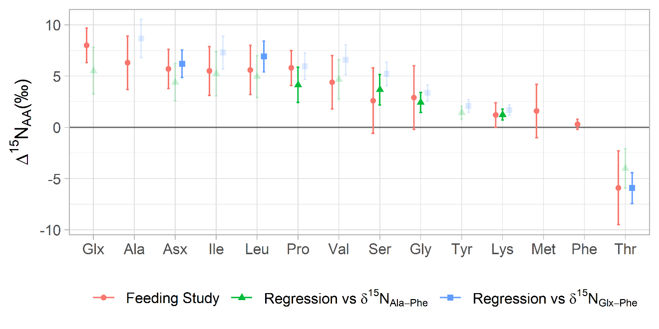 Red circles and error bars show the mean and standard deviation of δ15NSAA values estimated from 18 controlled feeding studies of marine metazoans with TP ≤ 3, as described in section 3.3. Blue squares and green triangles show the δ 15 N values estimated by regressing δ15NAA-Phe values against δ15NAla/Glx-Phe and δ15NAla-Phe, respectively. Some amino acids are shown to fractionate uniformly throughout food webs (Ala, Pro, Ser, Gly, Lys), so for these we emphasize the results of linear regression against δ15NAla-Phe. Others show variable trophic discrimination during metazoan vs protozoan metabolism (Glx, Asx, Leu, Thr), so for these we emphasize the results of linear regression against δ15NAla/Glx-Phe.