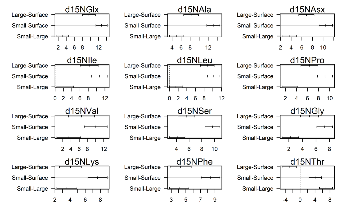 Each panel identifies the ability of the designated tracer to separate pairs of organic matter sources from one another. The y-axis identifies the contrast being assessed (e.g., Large-Surface indicates the difference between large deep particles and surface particles) which the x-axis indicates the magnitude of that difference. The center line on each bar indicates the average difference between groups in the pairwise comparison, while the ends of the segment indicate the difference necessary to differentiate the groups with >95% confidence. When the entire bar lies above or below 0, this indicates a significant difference between groups with respect to the indicated tracer.