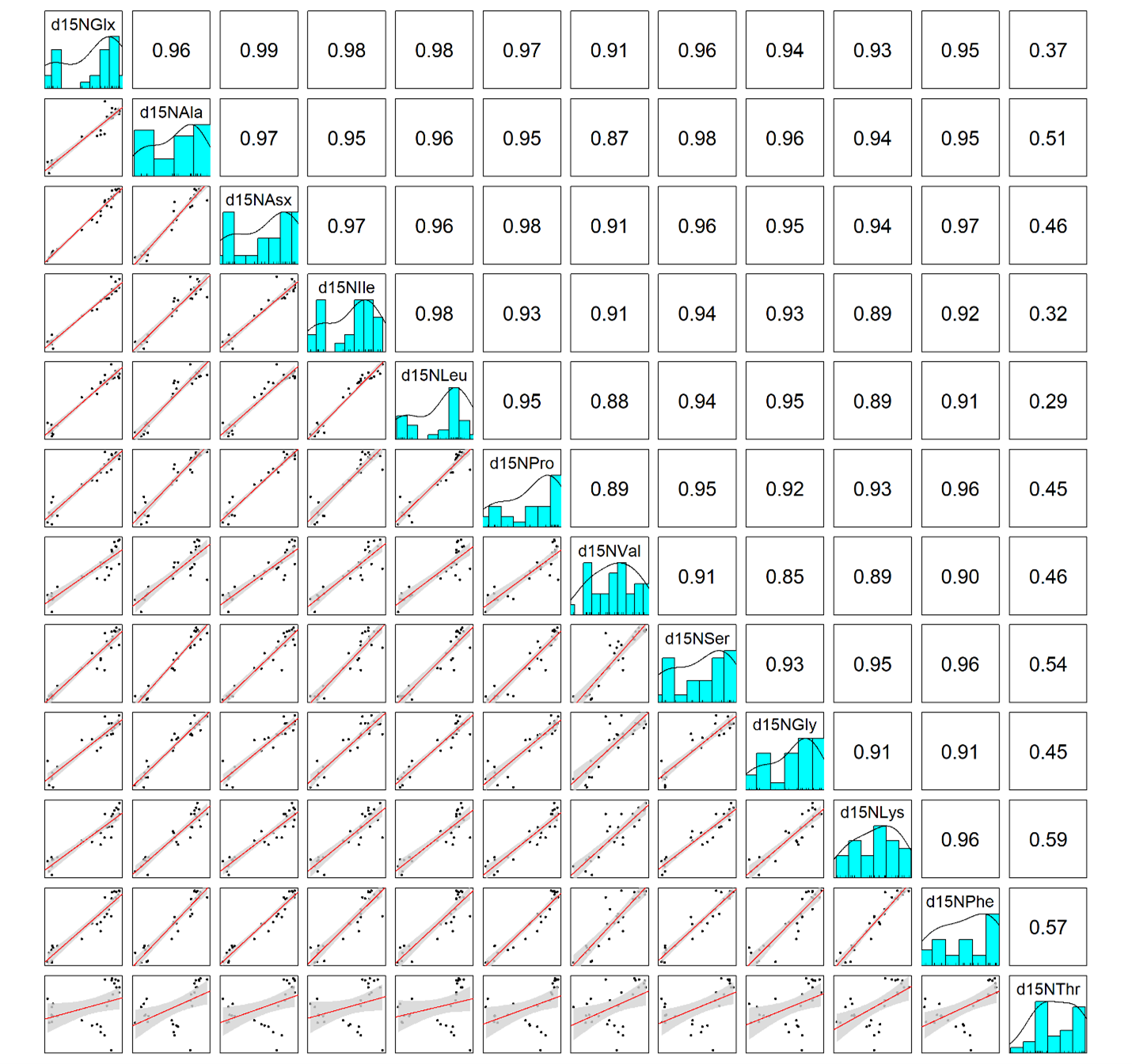 Pairwise correlations between all δ15NAA values were assessed by calculating Pearsons correlation coefficients for all possible pairs of tracers. Coefficients are shown for the indicated pair in the top right, histograms of tracer values are shown along the diagonal, and linear regressions are plotted in the bottom left.