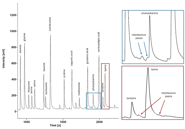 The signal intensity from the mass 28 detector is plotted through time for a zooplankton sample analyzed as trifluoroacetic amino acid esters using a gas chromatograph coupled to an isotope ratio mass spectrometer equipped with a 60 m ×0.32 mm BP×5 column (for details see Hannides et al. , 2009, 2020; (Shea et al., 2023) . The blue and red insets show closeups of the areas around phenylalanine (top) and lysine (bottom). Though many samples exhibit clean baselines around these peaks, it is not uncommon to observe interference by unknown, co-eluting compounds as exhibited by this sample. This occurrence is specific to the chemical preparation methods, derivatization techniques, and chromatographic conditions used to generate these data.