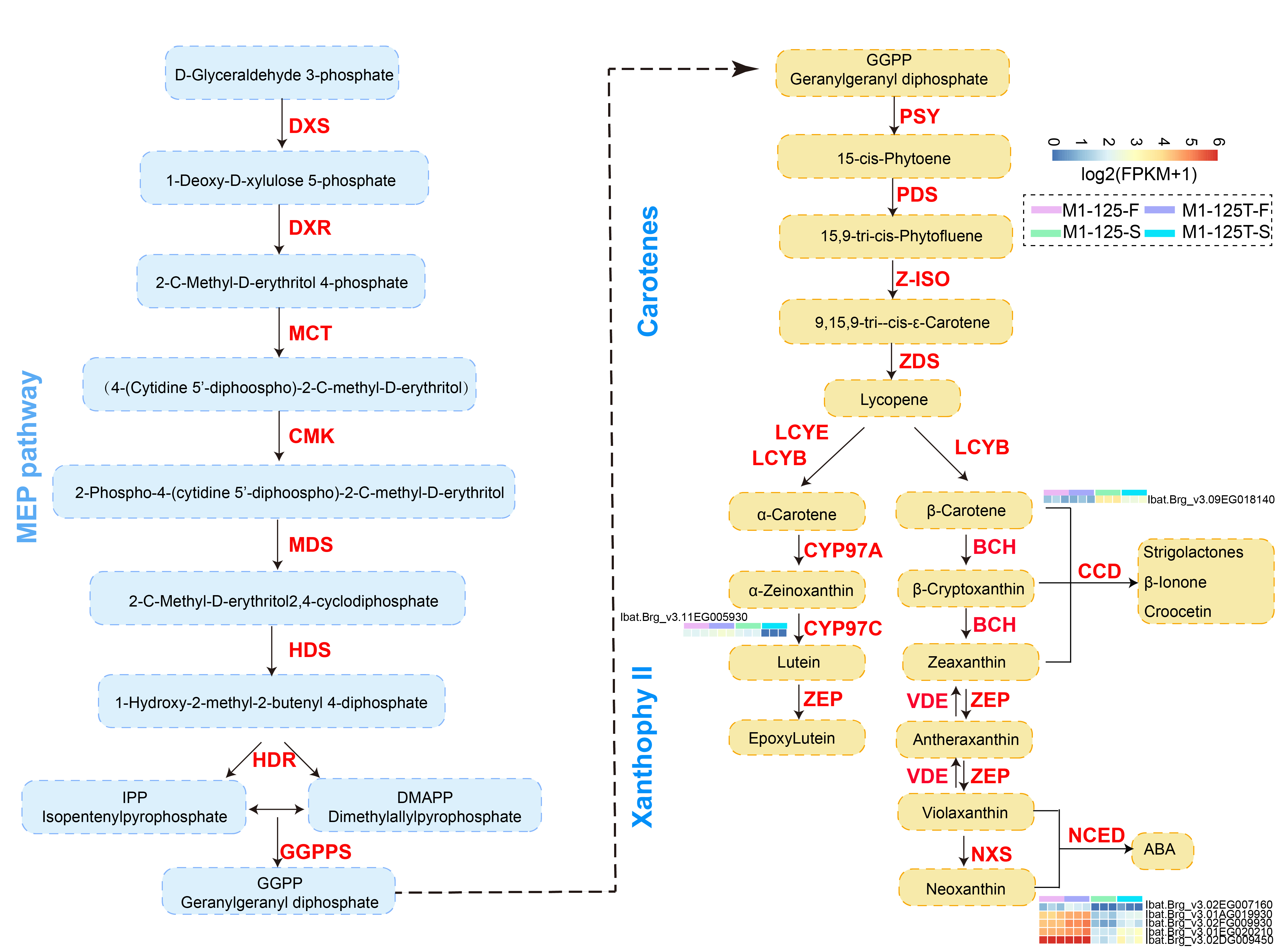 The line M1-125 (red skin and yellow flesh) and line M1-125T (yellow skin and yellow flesh) were two clones derived from a hybrid offspring with ‘Xushu 45’ as the maternal parent. They were planted in the modern agricultural experimental farm of the Xuzhou sweetpotato research institute. The flesh and skin of their storage root were sampled with three biological replicates at 120 DAP (days after planting), then washed and cut into small pieces. All samples were immediately frozen in liquid nitrogen and subsequently stored at −80 °C for RNA extraction and library construction. In the second year, progenies of two materials were cultivated, and their leaves, stems, petioles, flesh, and root skin were sampled in 120 DAP following the aforementioned method for RNA extraction, which was subsequently used for RT-qPCR validation experiments.
