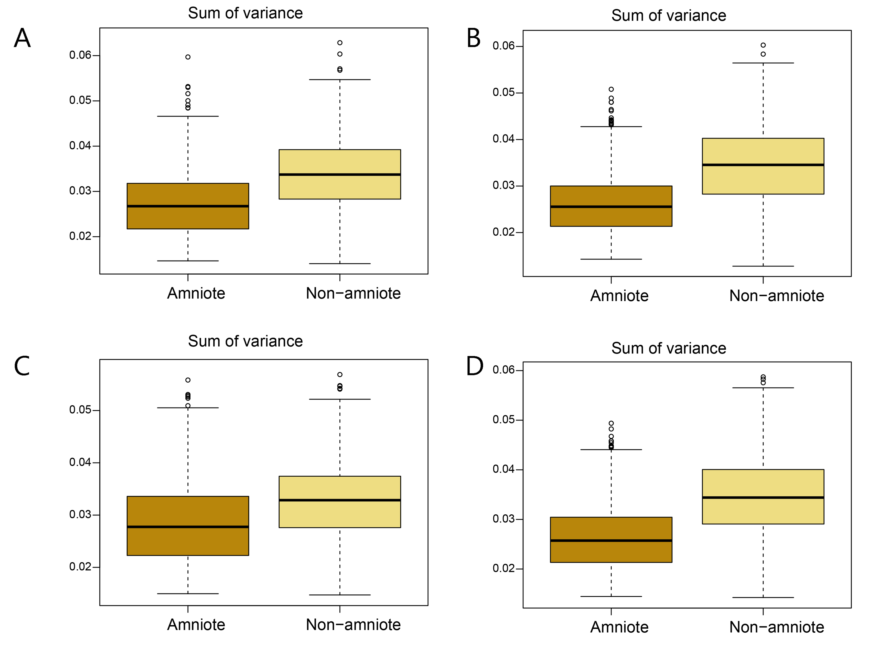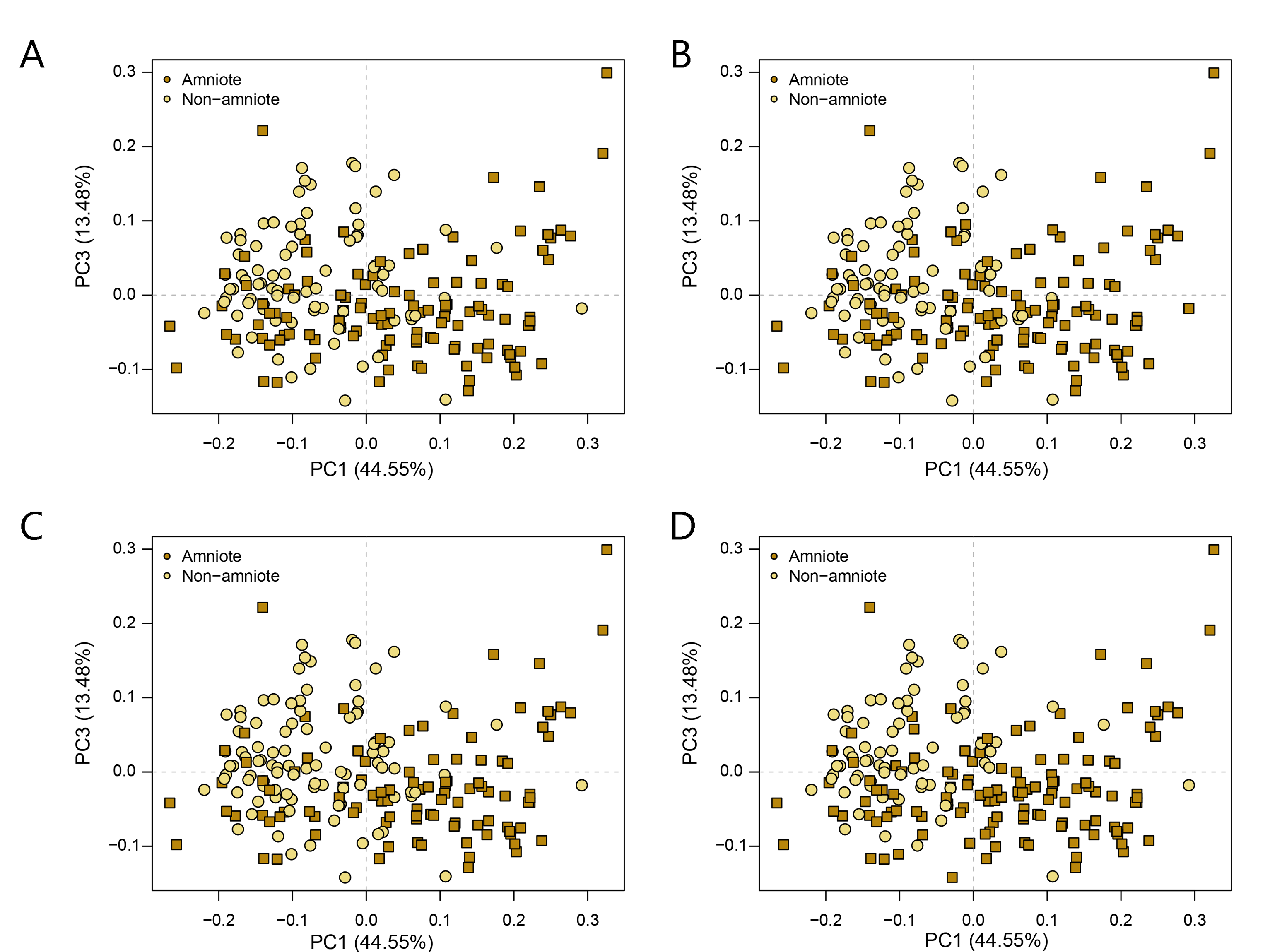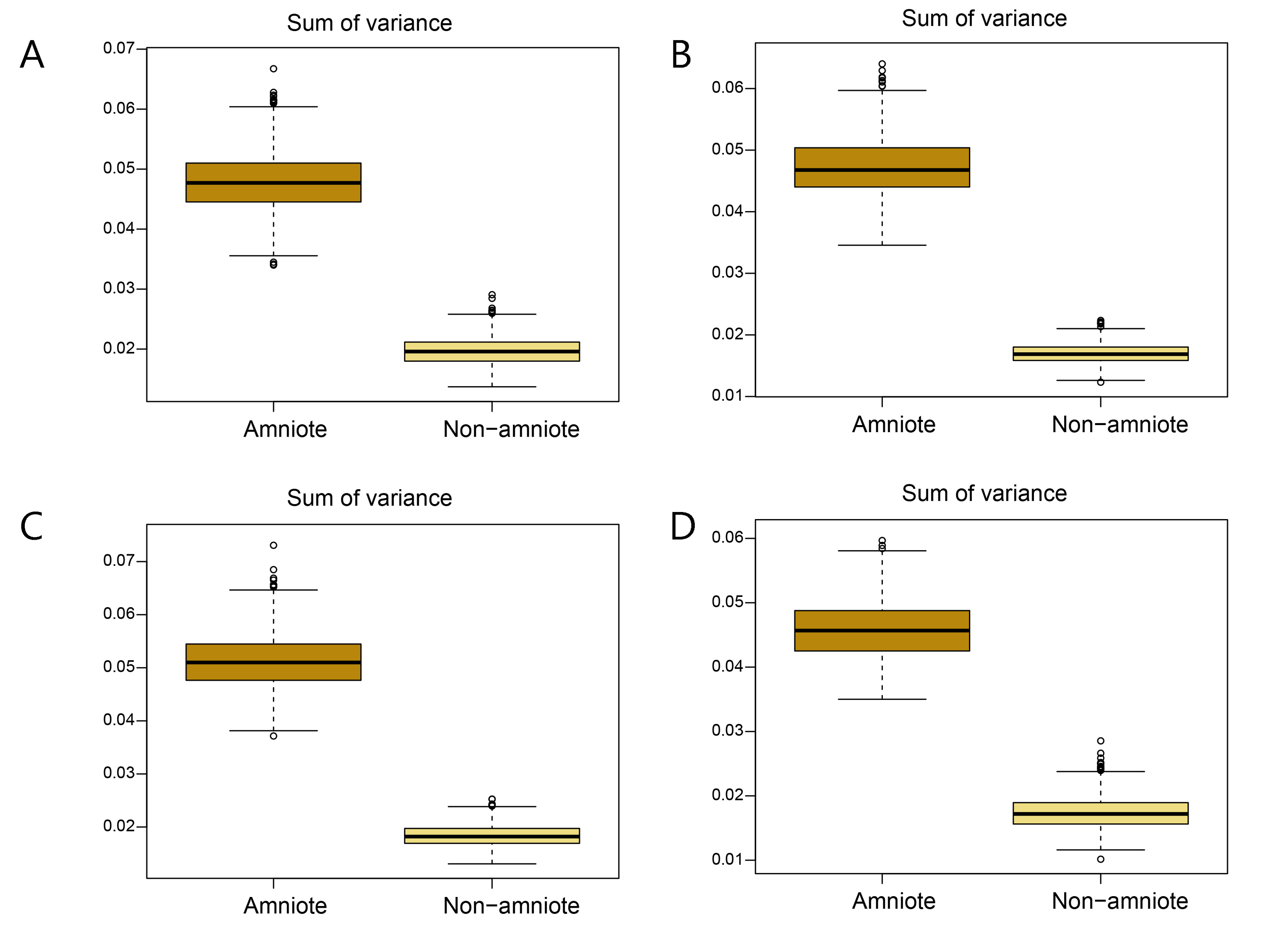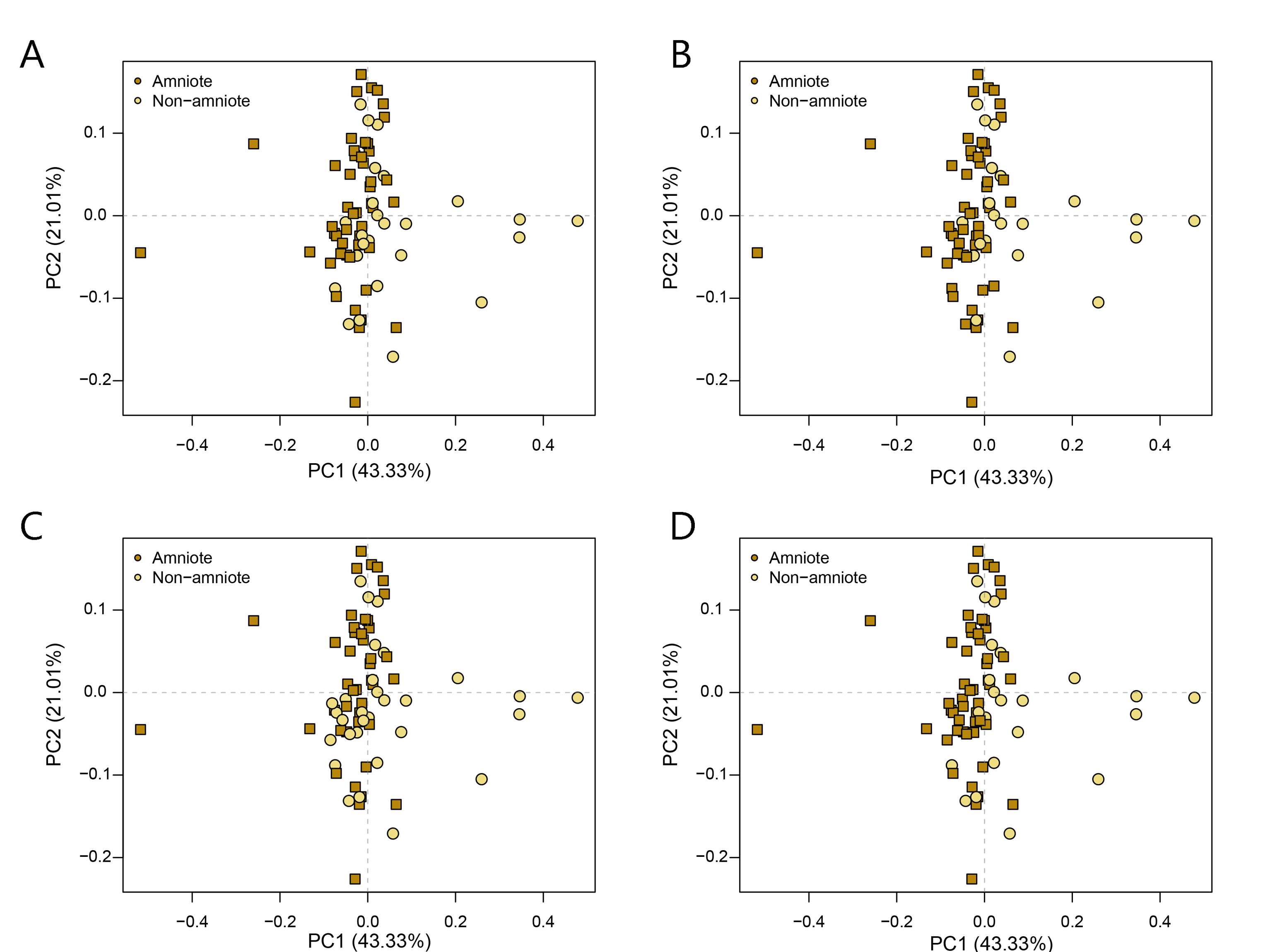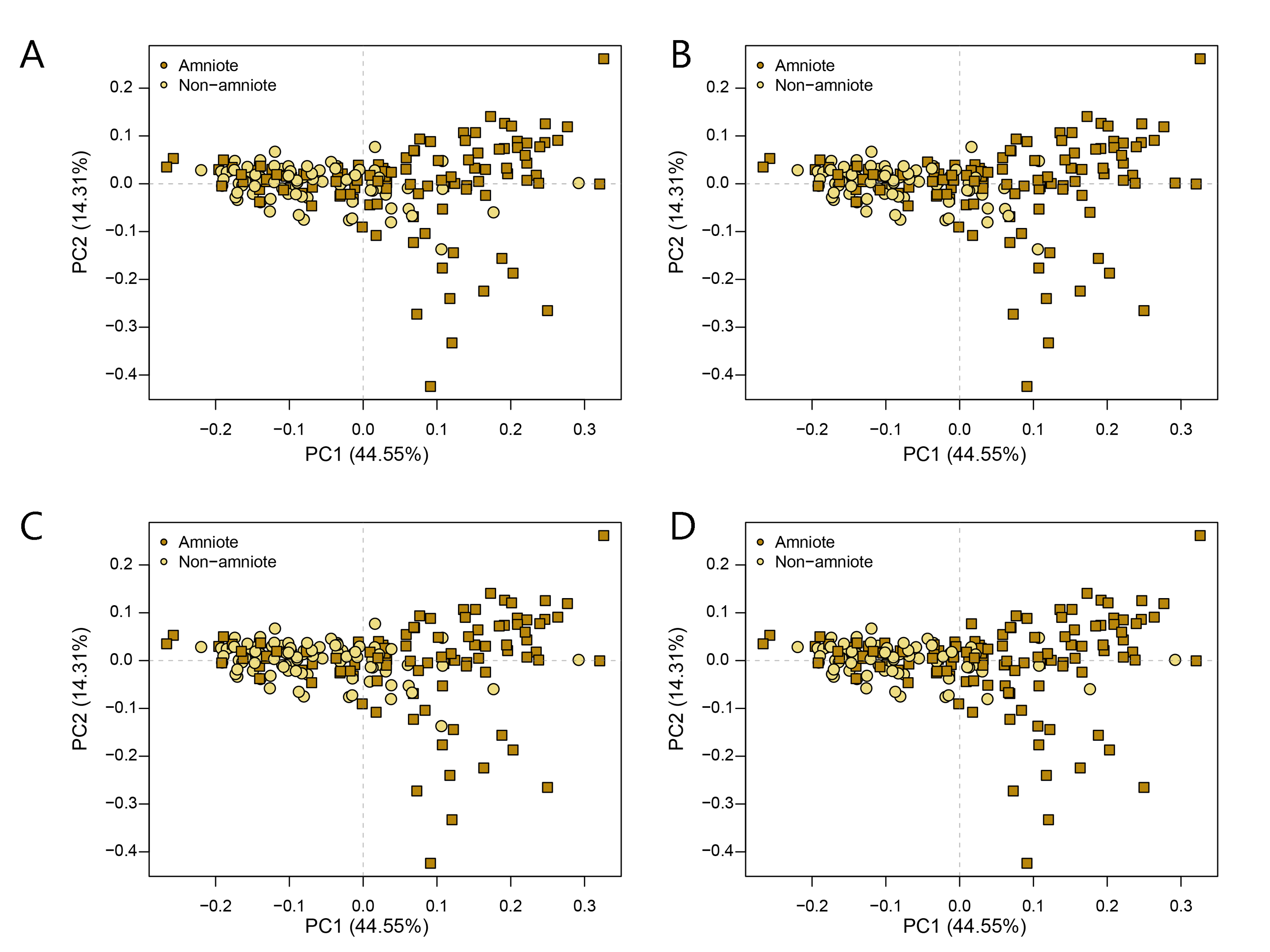A = baseline hypothesis; B = hypothesis 2 (Diadectomorpha are synapsid amniotes); C = hypothesis 3 (Captorhinidae and Araeoscelidia are non-amniote tetrapods); D = hypothesis 4 (Recumbirostra are sauropsid amniotes).