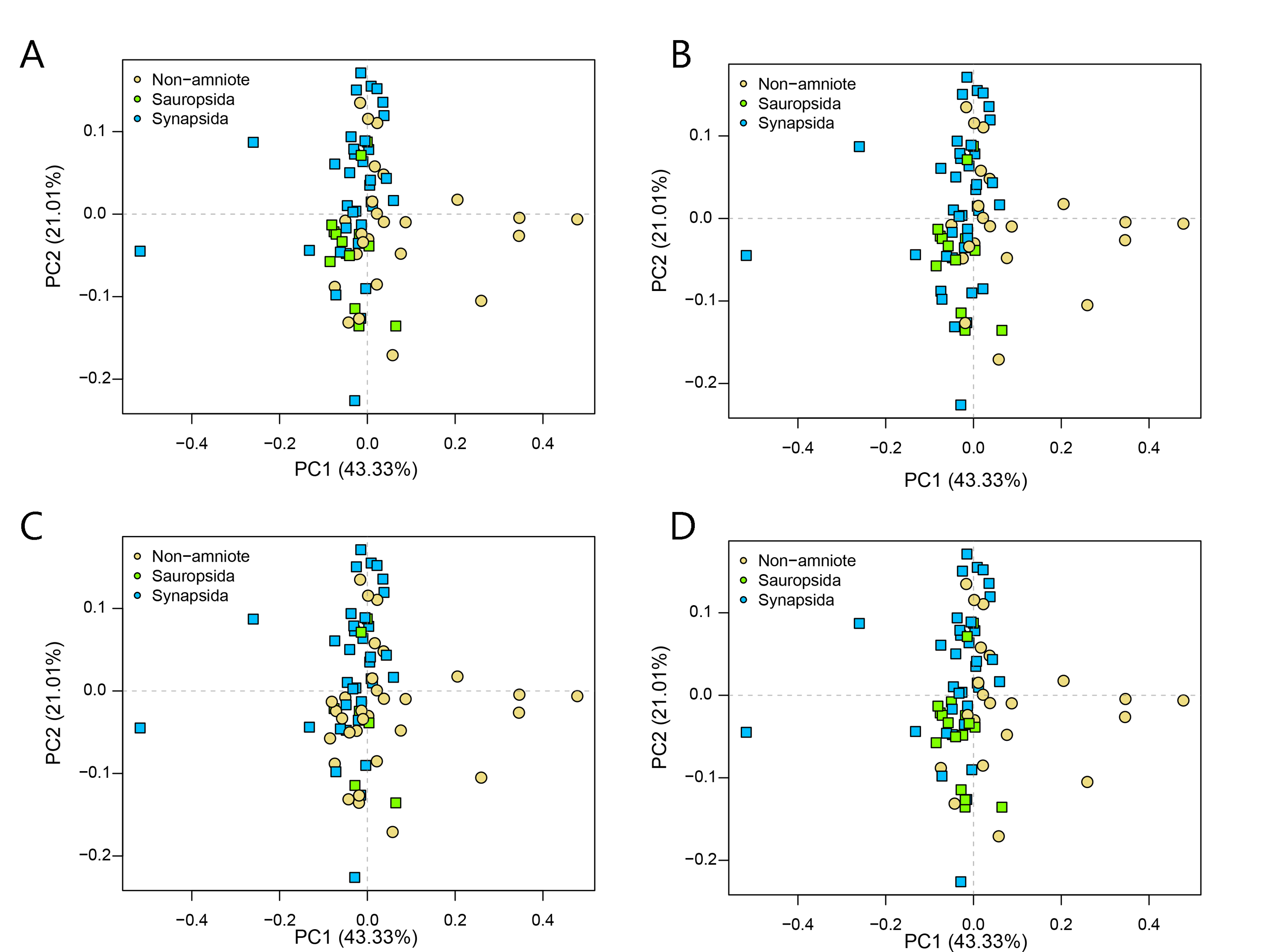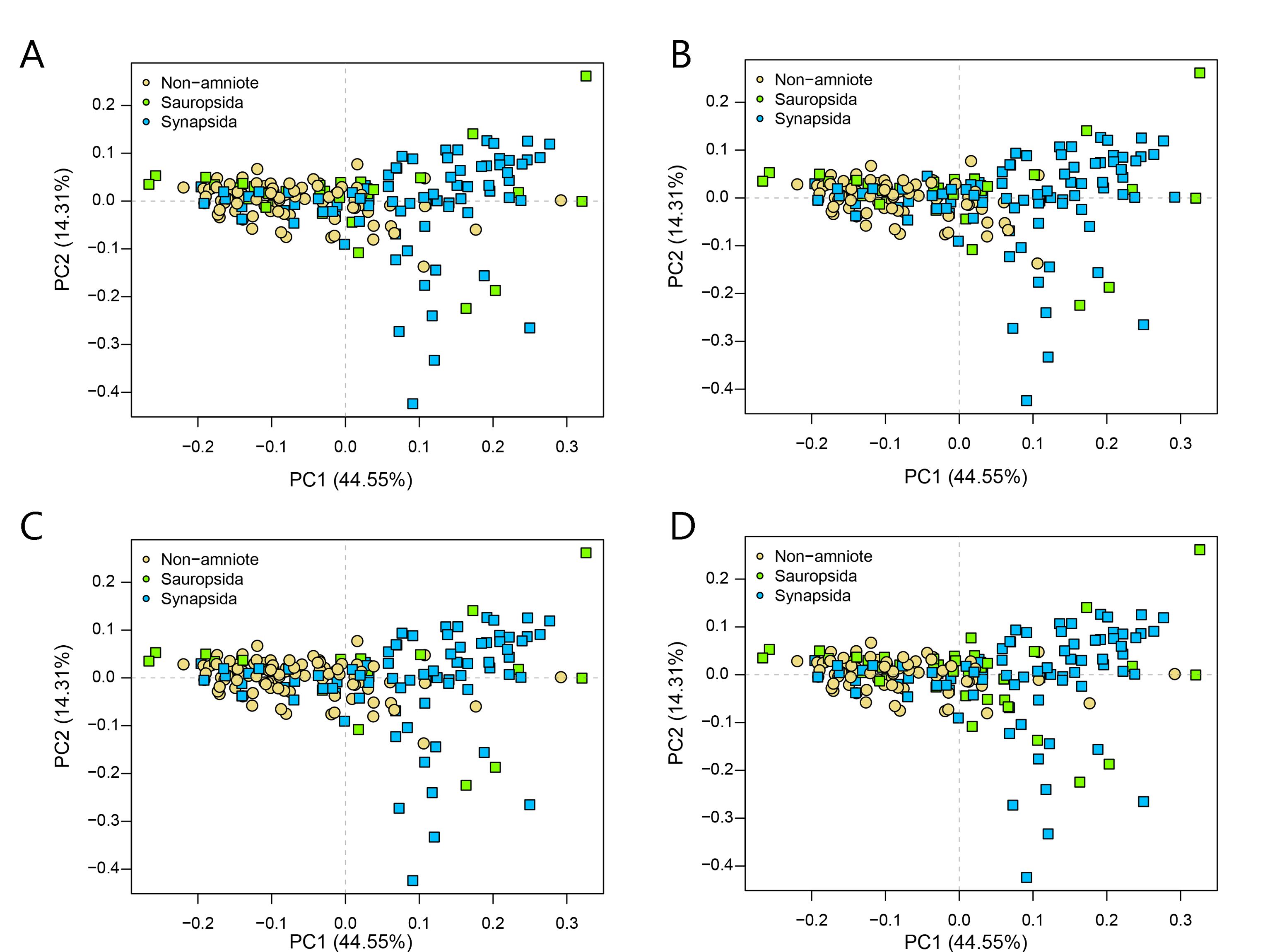 PC axes 1 and 2 exemplify the greater functional disparity of amniotes with respect to non-amniote tetrapods (Fig. 2A). The highest PC1 value is found in the dicynodont anomodont Daptocephalus leoniceps (5.8) (File S3C). This corresponds to a deep jaw with a relatively slow jaw opening, whereby the articular sits at a high angle with respect to the functional “dental” row. The three highest values are achieved by dicynodont anomodonts. High PC1 values in general are dominated by herbivorous taxa such as the edaphosaurid Edaphosaurus boanerges (4.01), the diadectid Diadectes lentus (4.01), the dinocephalian Ulemosaurus svijagensis (3.64) and the pareiasaur Scutosaurus sp. (3.29) (Fig. 2A; File S3C). Two carnivorous tetrapods have a PC1 value greater than 1.9; the diplocaulid Diploceraspis burkei (2.56) and the sphenacodontid Dimetrodon sp. (1.96). The majority of non-amniote tetrapods are confined between PC1 values of −3.0 and 1.0, depending on the definition of Amniota used (Fig. 2A; File S3C). Positive non-amniote tetrapod outliers in PC1 include the diadectids D. lentus and Desmatodon hesperis (excluding hypothesis 2) and the diplocaulid D. burkei, reflecting their relatively deep jaw rami and, especially in the case of D. burkei, high articular offset. The chroniosuchian Chroniosaurus dongusensis has the lowest PC1 value in our dataset (−2.83), followed by other carnivorous taxa such as the younginid Youngina capensis (−2.82), Doragnathus woodi (−2.64) and Varanosaurus acutirostris (−2.37) (File S3C). Regarding PC2, the highest value is recorded in the cynodont Dvinia prima (4.27). Only derived therapsids, such as dicynodonts, gorgonopsians and therocephalians, inhabit PC2 values exceeding 1.5 (Fig. 2A; File S3C), reflecting jaws with a relatively short insertion site of the adductor musculature and thereby resulting in low transmission of adductor muscle force to bite force. Among the lowest PC2 values are various herbivorous tetrapods, such as the caseid Casea broilii (−3.28), the diadectid D. lentus (−2.98) and the edaphosaurid E. boanerges (−2.81) (Fig. 2E; File S3C).