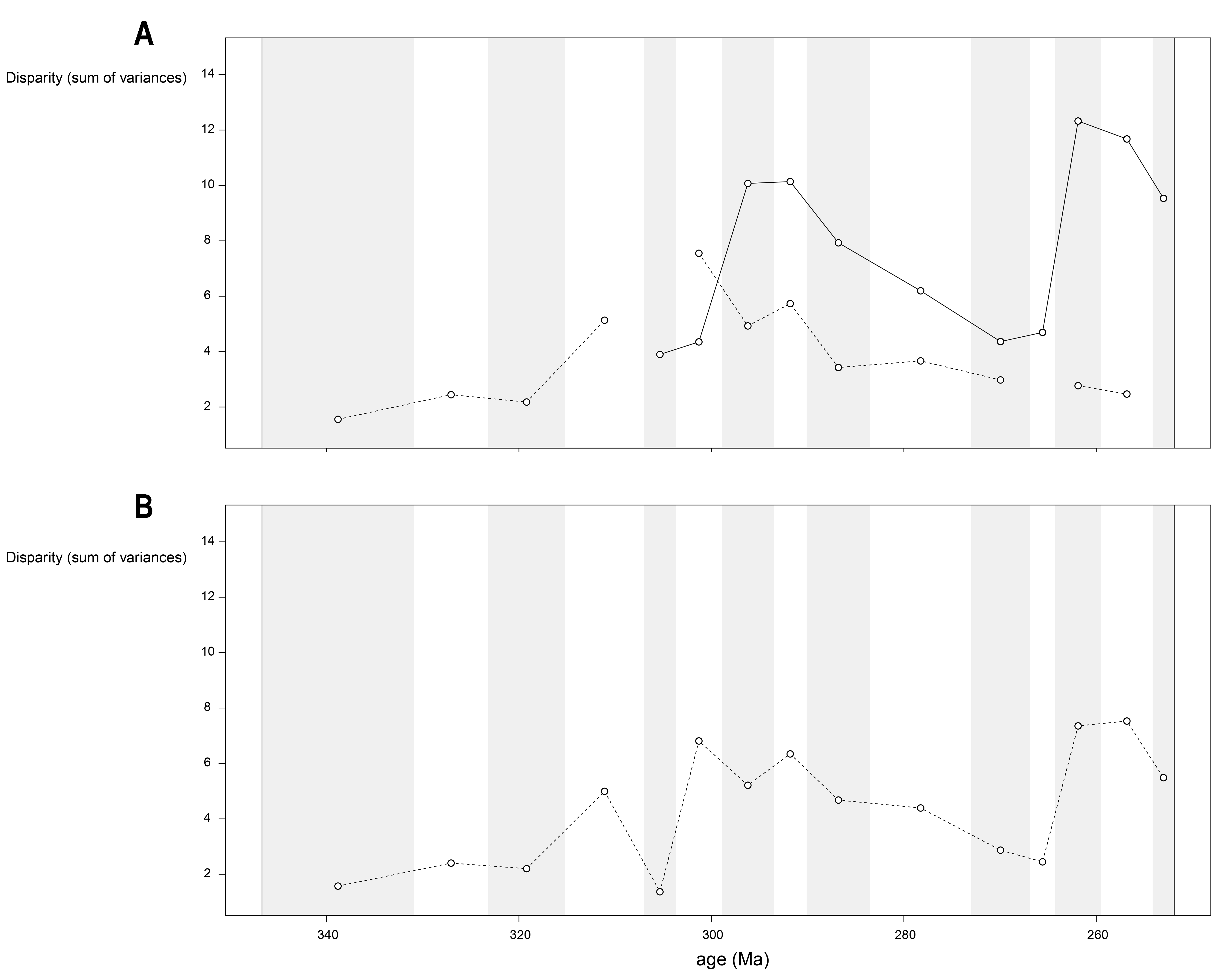 Figure 6: Lateral shape disparity through time, under the baseline phylogenetic hypothesis.