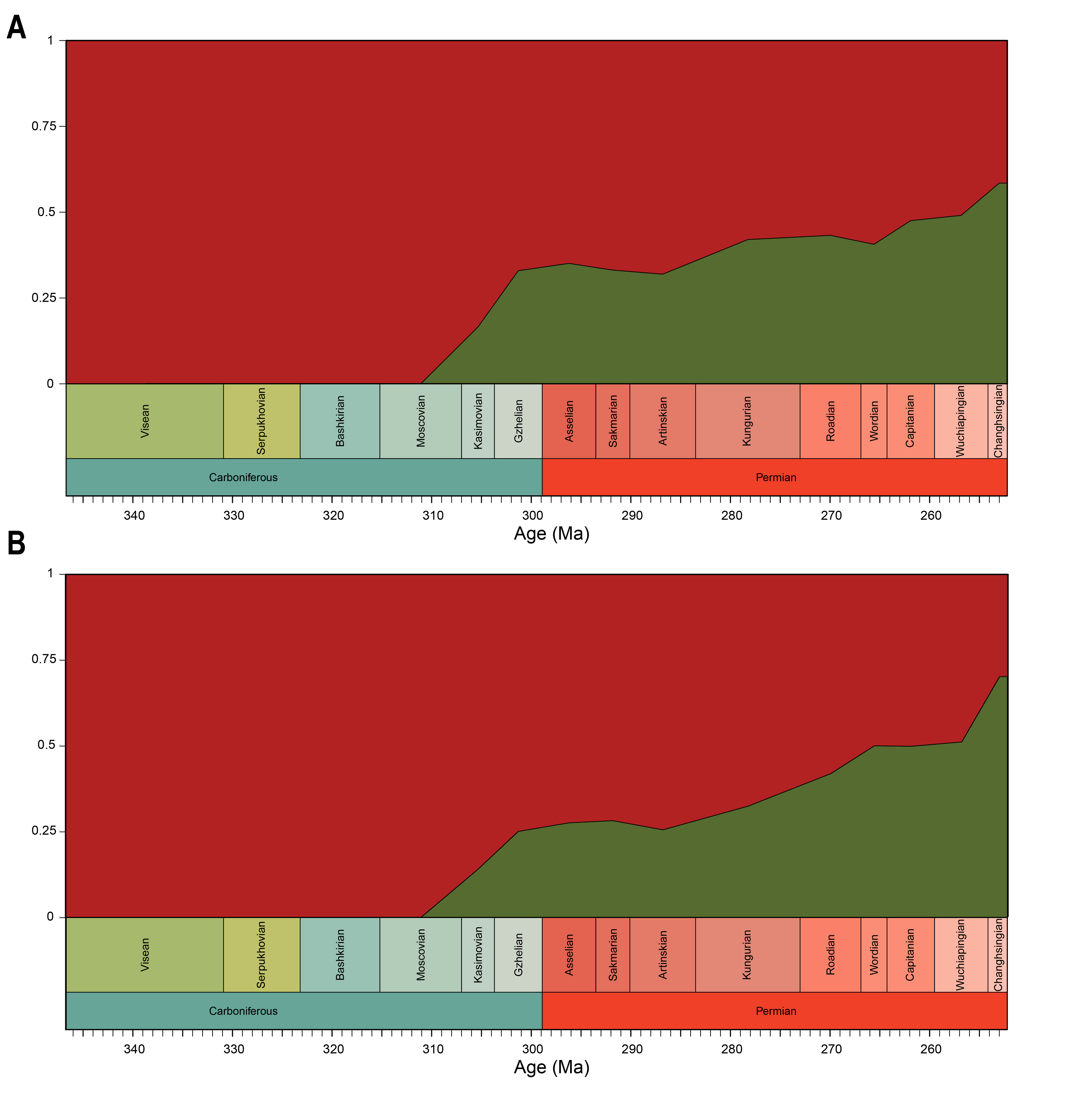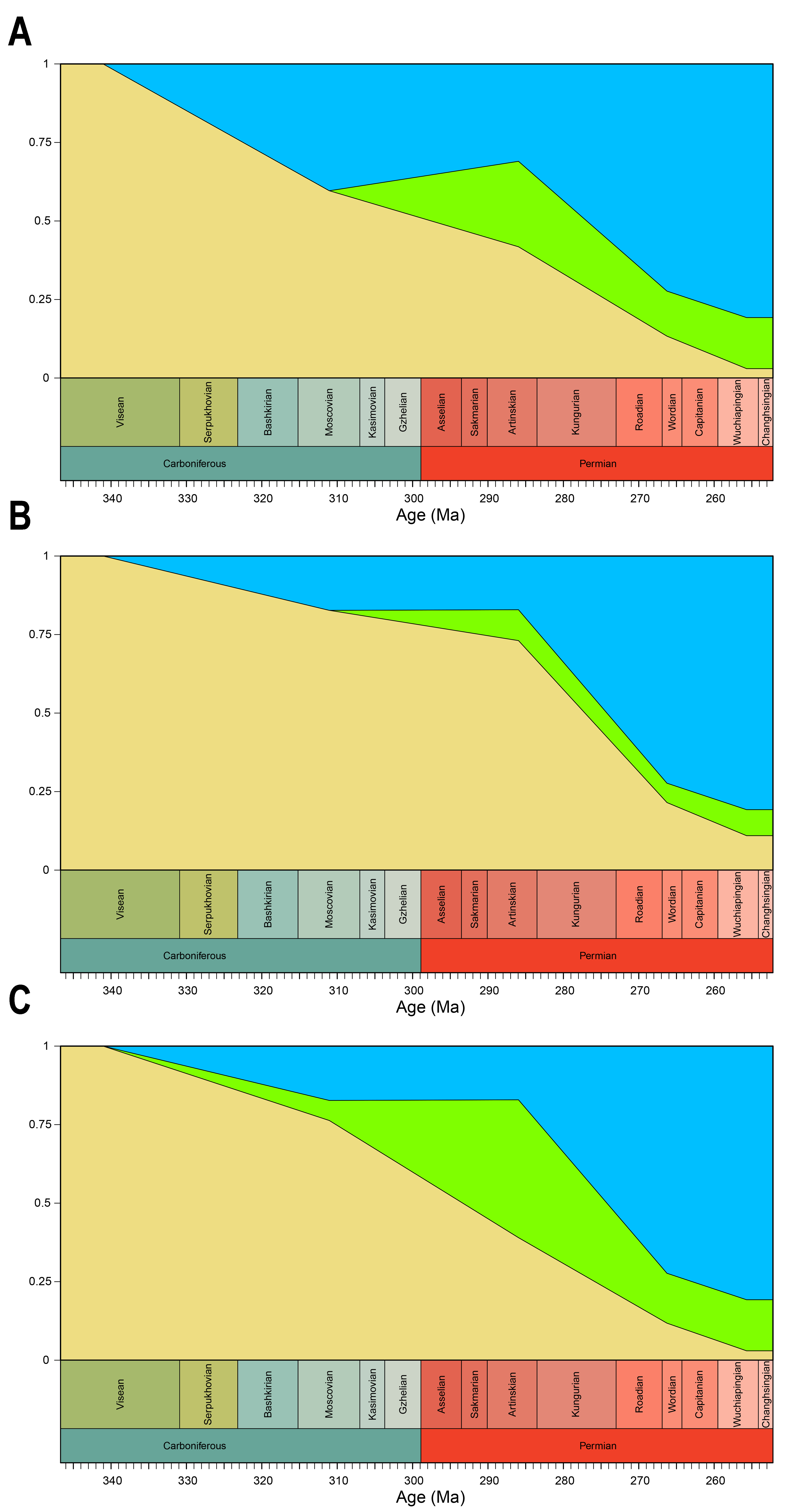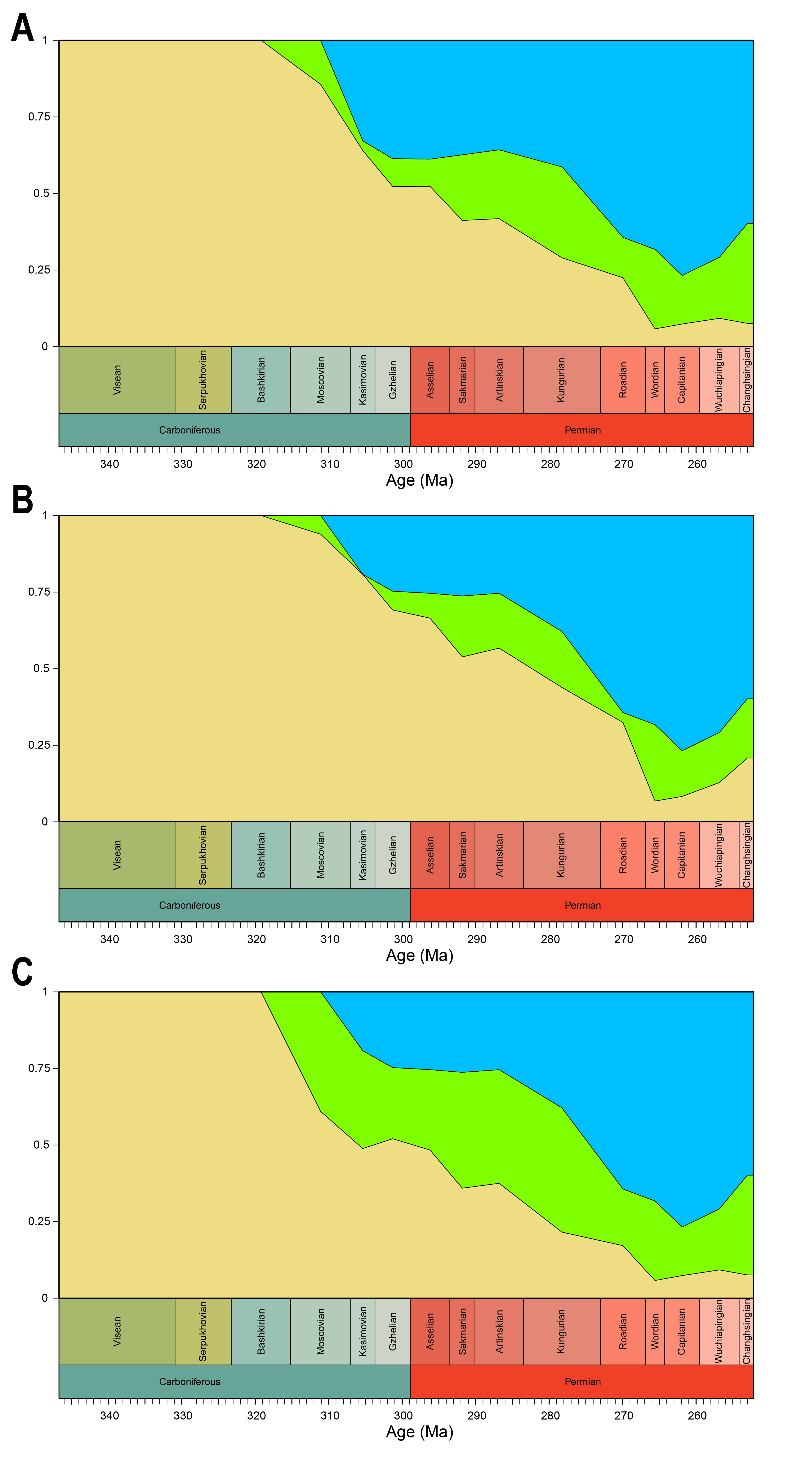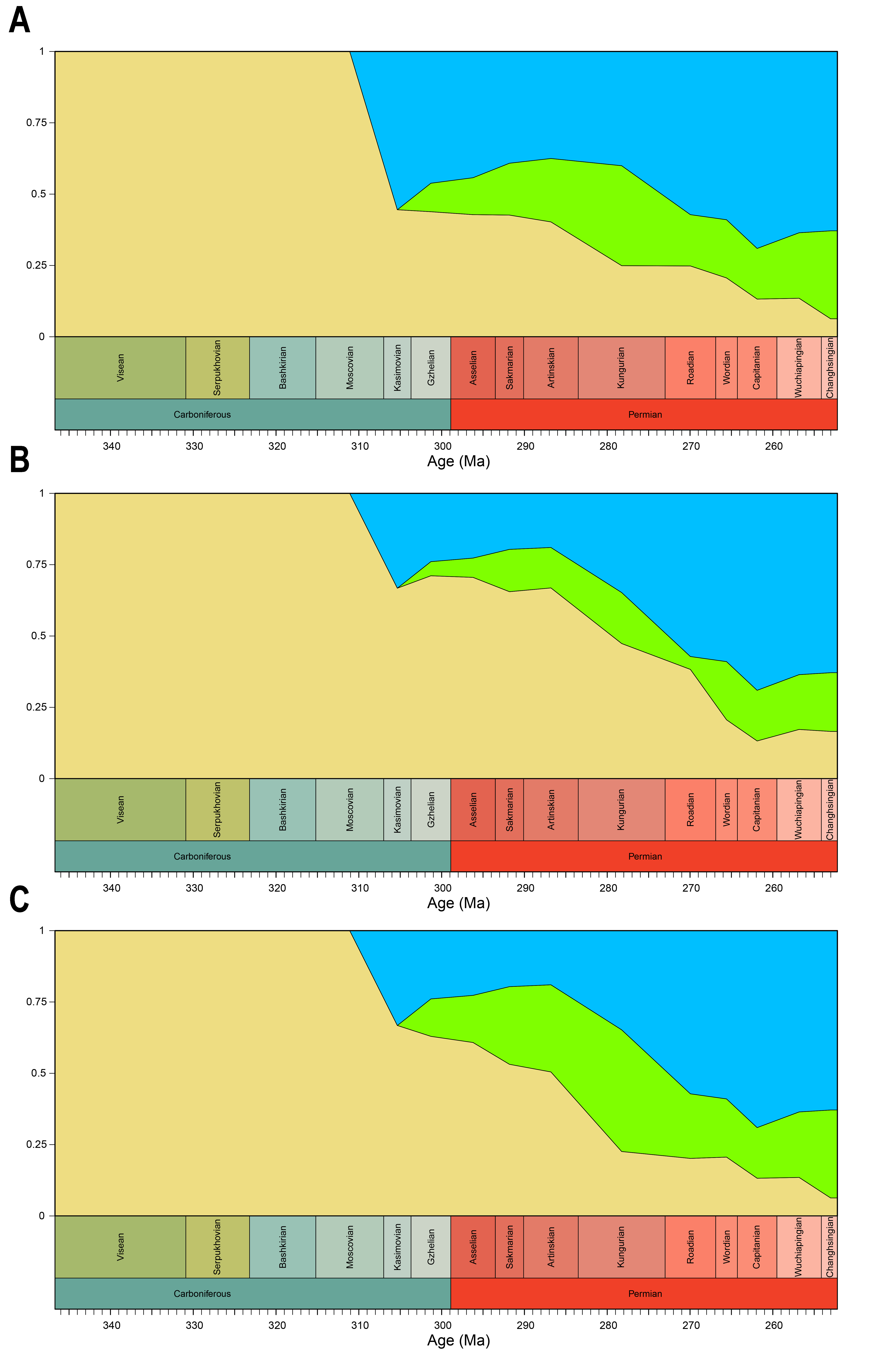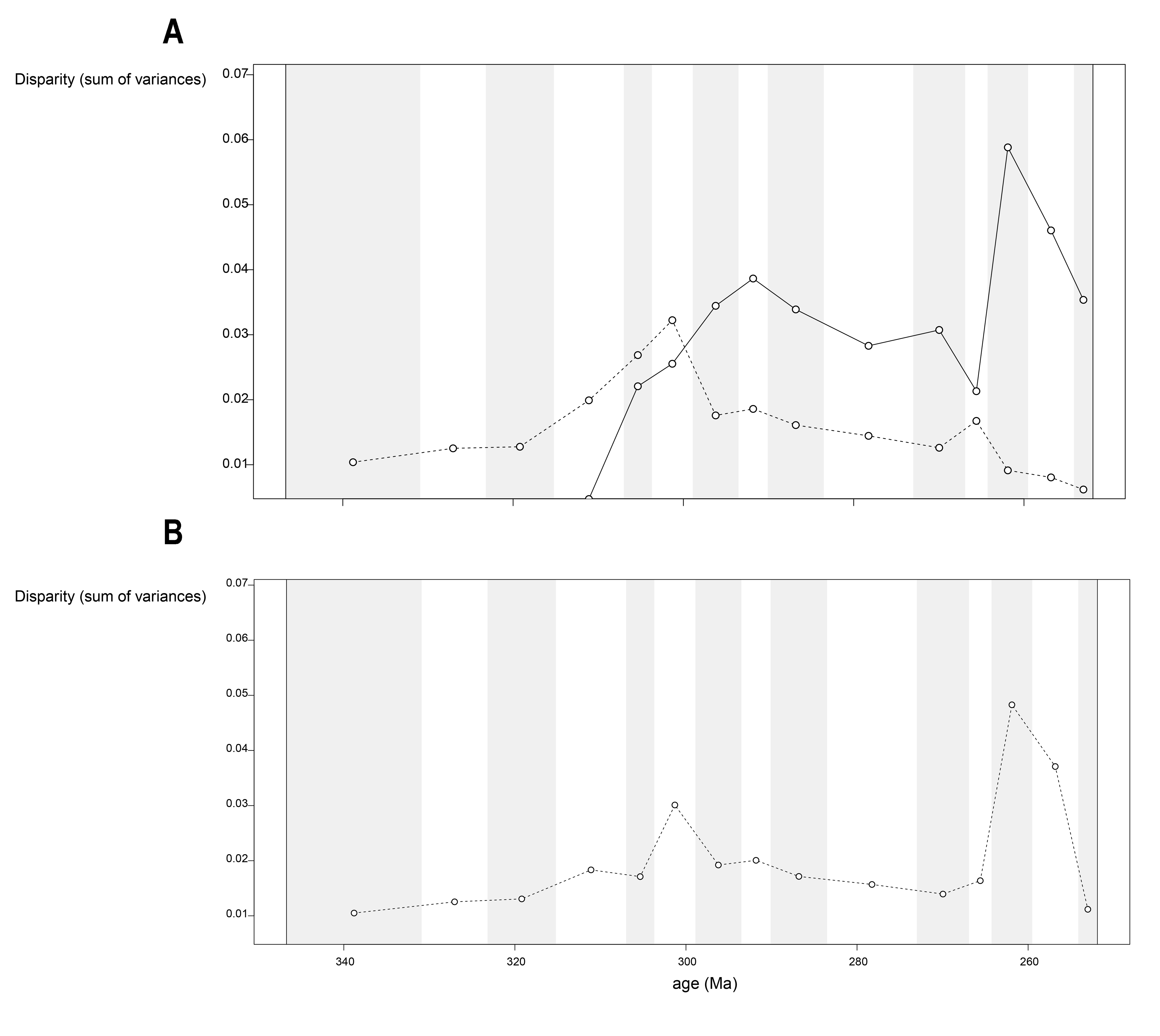 Relative contribution to overall disparity of non-amniote tetrapods decreases throughout the Pennsylvanian-Permian in all three datasets (Figs. 3A, 6A, 8A). By the end of the Kungurian, relative disparity of non-amniote tetrapods has dropped below 50% in all three datasets under all definitions of Amniota. However, in most analyses, this 50% mark is reached earlier. In the functional disparity analysis, non-amniote tetrapod relative disparity drops below 50% in the Kasimovian when diadectomorphs are considered amniotes. While the decrease of non-amniote tetrapod relative disparity is continuous under most phylogenetic hypotheses, there is a small rebound in the Lopingian when captorhinids, protorothyridids and araeoscelidians are treated as non-amniote tetrapods. This increase is caused by the inclusion of moradisaurine captorhinids, e.g., Moradisaurus grandis and Gansurhinus naobaogouensis.