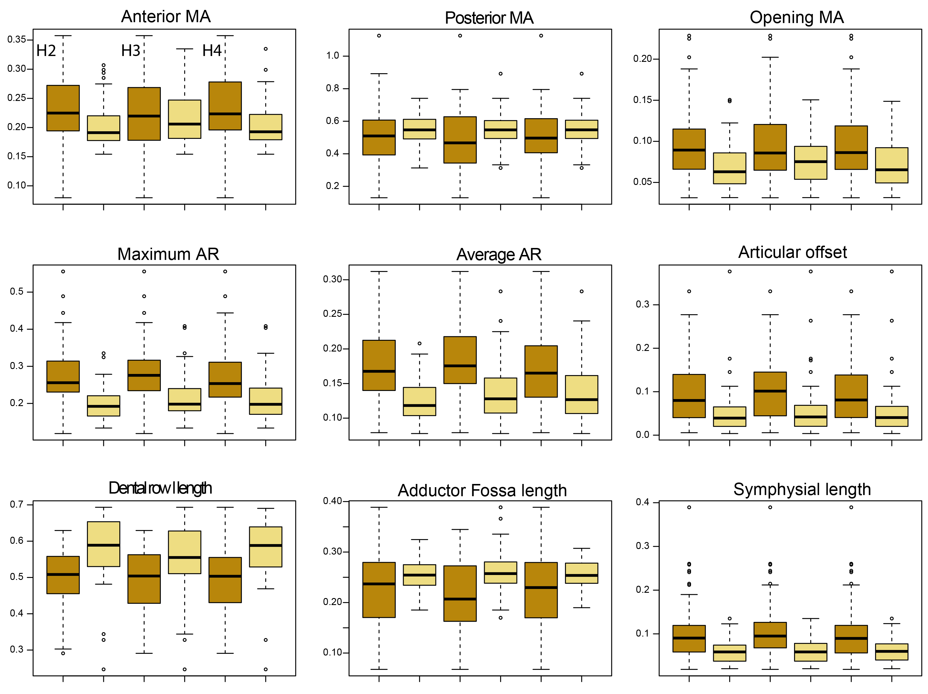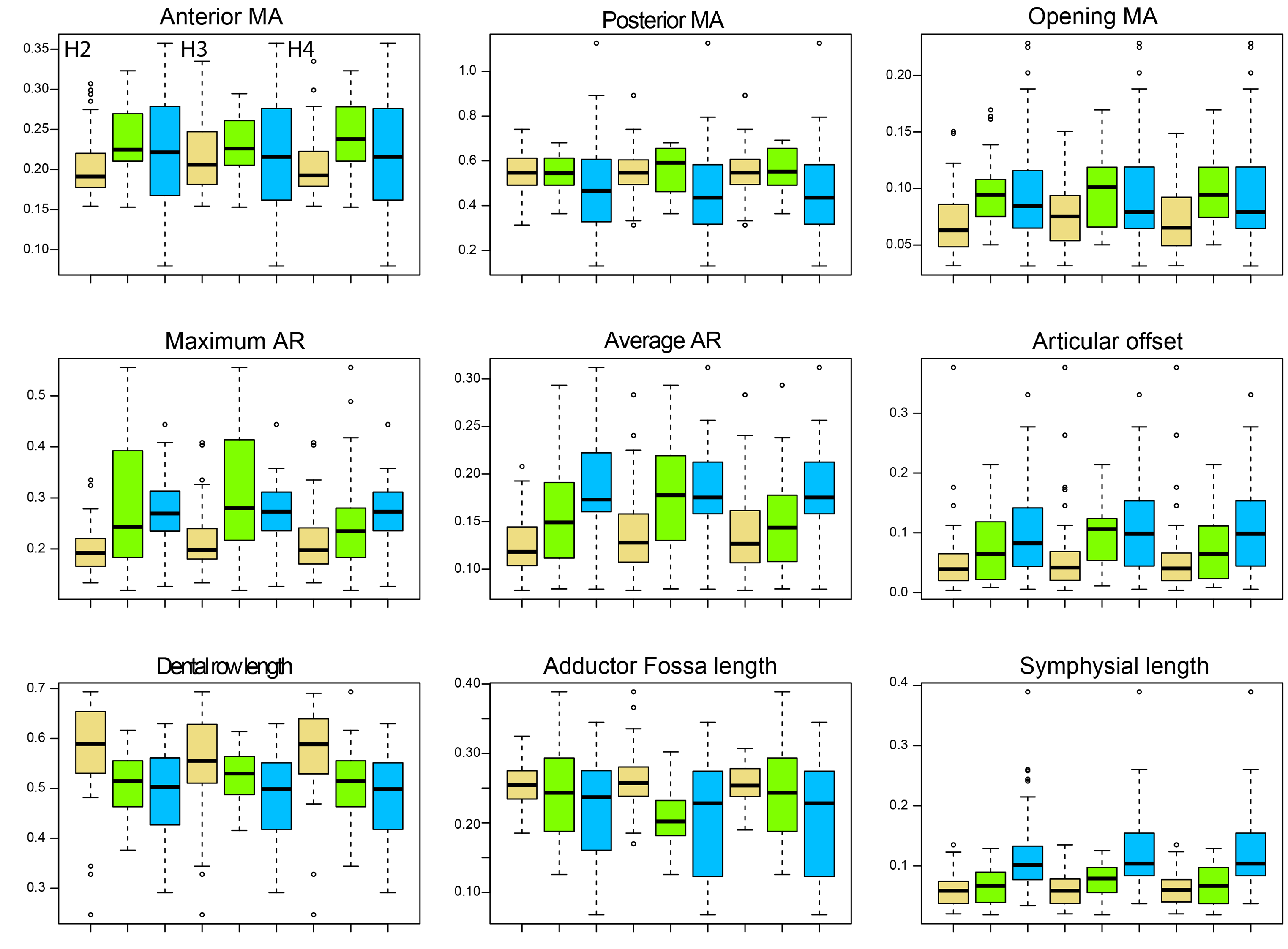 Disparity of jaw biomechanics under all four phylogenetic hypotheses.