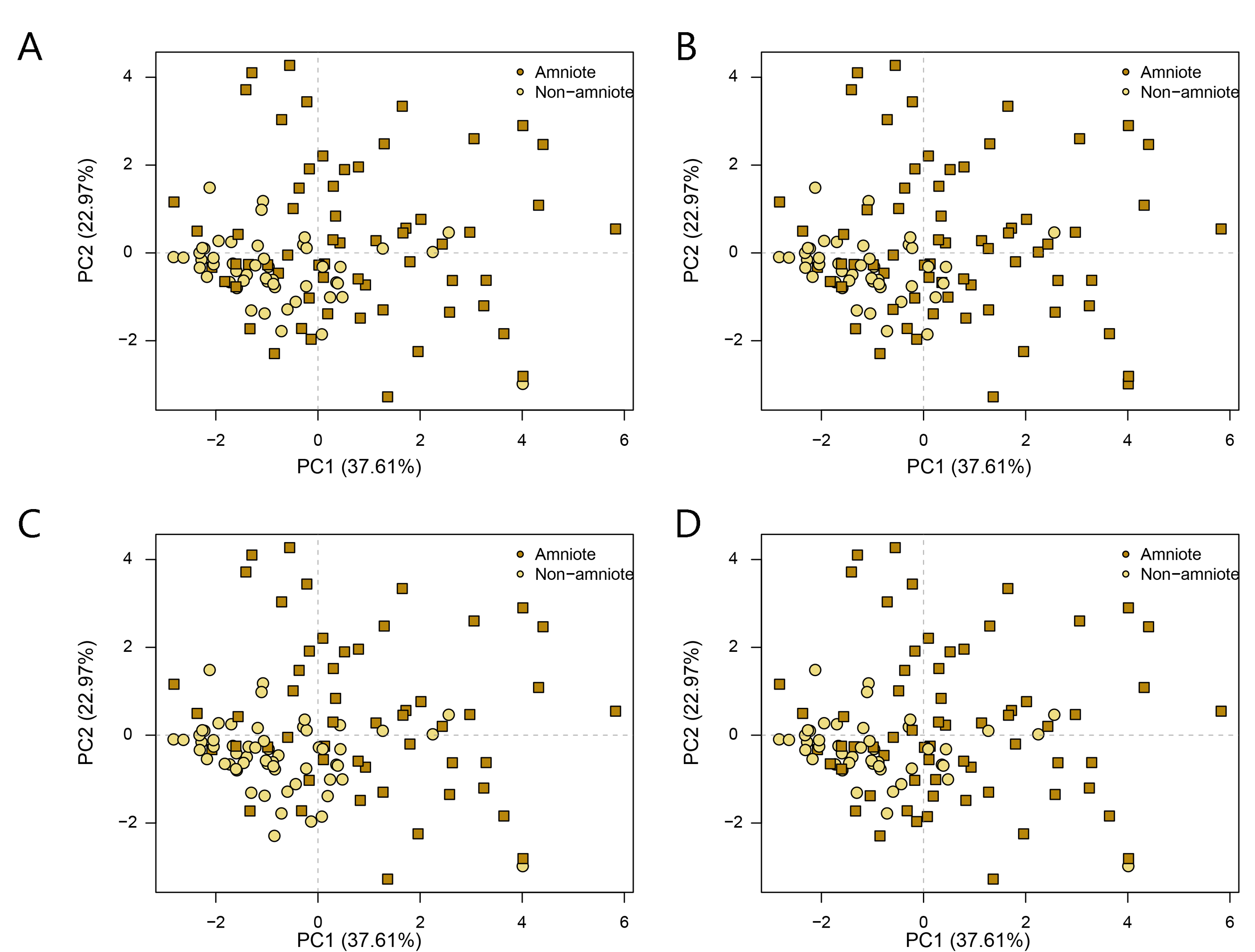 PCA PC1-2 of the lateral shape analysis under all four phylogenetic hypotheses.