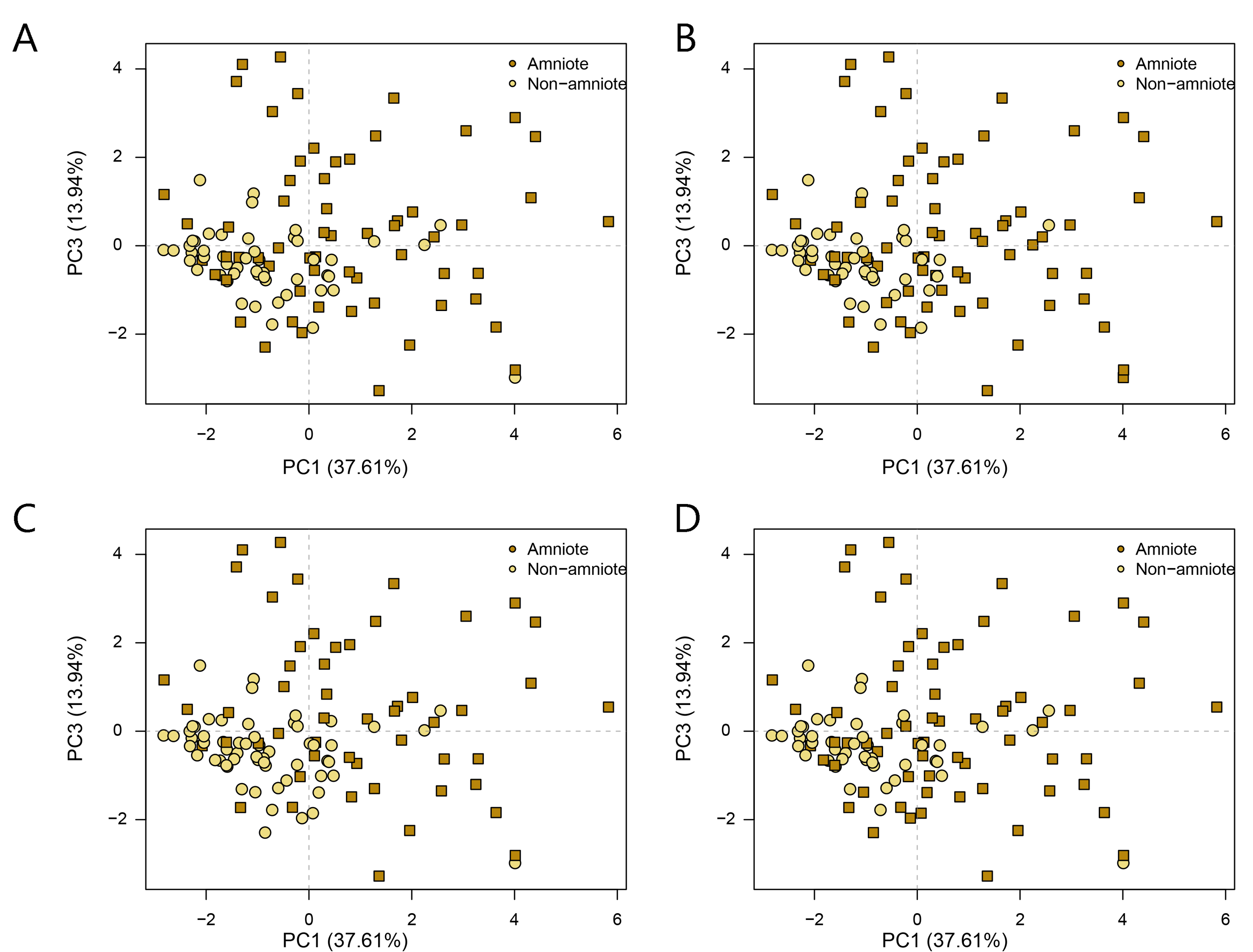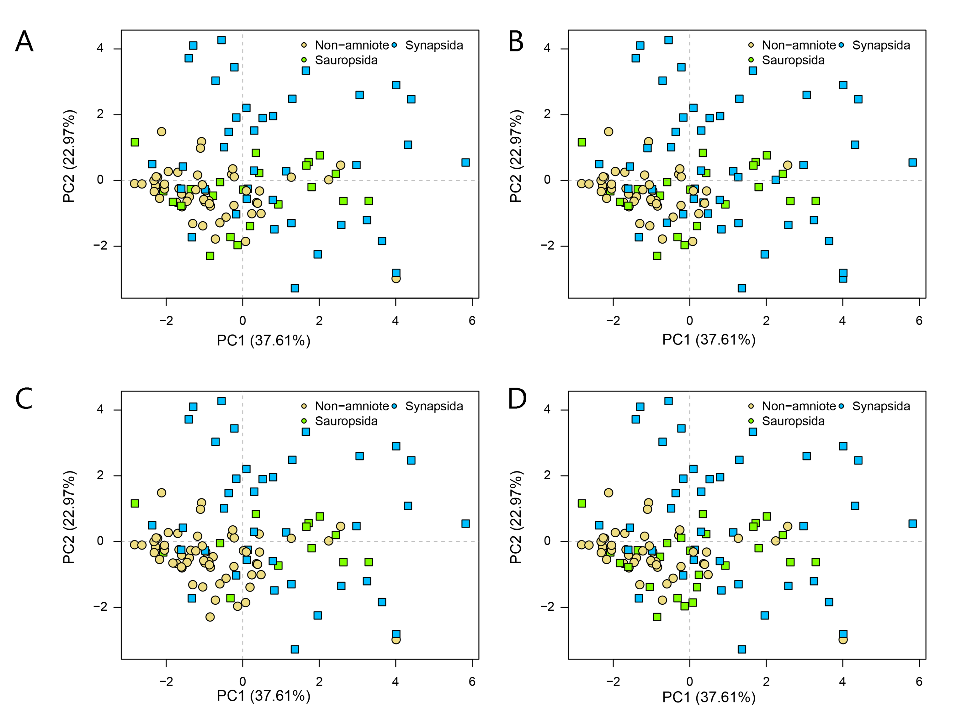 Each measurement was then standardized by Z-transformation so that the average value for each trait approaches 0 and the standard deviation approaches 1, ensuring equal weights are given to the individual measurements (e.g., Benevento, Benson & Friedman, 2019). The measurement data were subsequently subjected to Principal Component Analysis (PCA) using the prcomp function of the stats package (R Core Team, 2021). We assessed disparity and centroid position separation for the aforementioned clade and dietary categories. We also compared between the two major subclades of Amniota: Synapsida and Sauropsida. To assess disparity, we calculated the sum of variances from the PCA coordinates, using the dispRity function of the dispRity package (Guillerme, 2018). Sum of variances characterizes the volume that a subgroup occupies in morphospace (Guillerme et al., 2020). This disparity metric is relatively insensitive to small sample size effects (Wills, 1998; Brusatte et al., 2008; Hopkins & Gerber, 2017). Significance of morphospace separation is tested based on the centroid position on all PC axes through PERMANOVA tests using the vegan package (Oksanen et al., 2024).