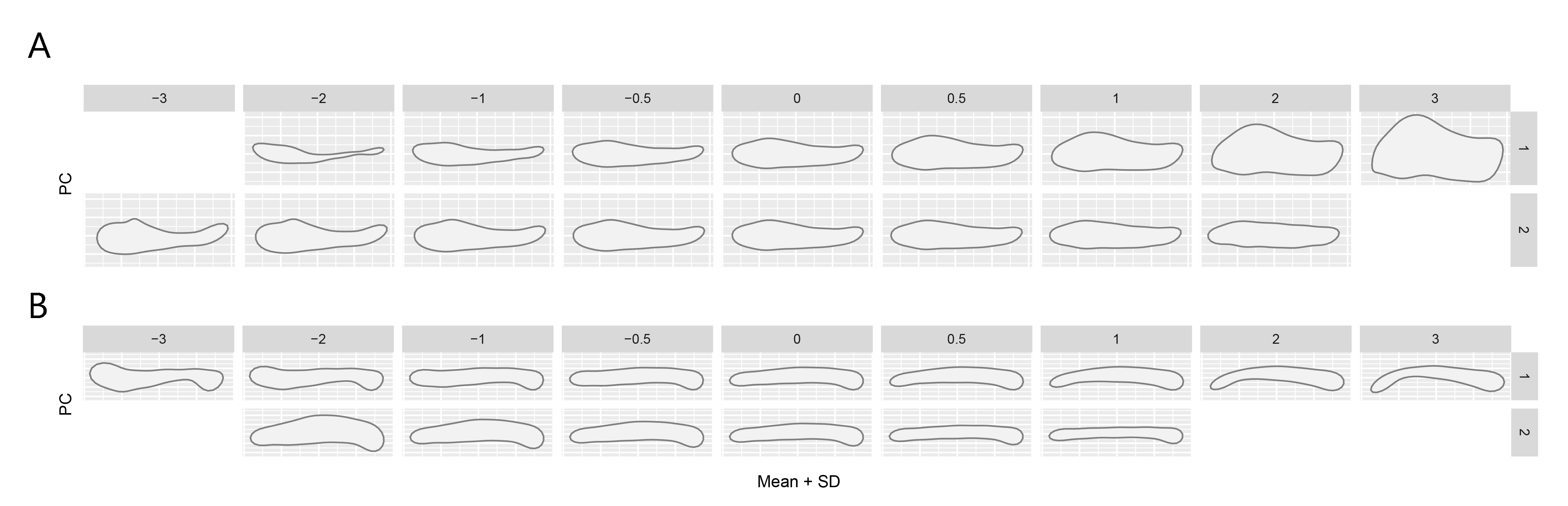 Elliptical Fourier analysis (EFA), often referred to as outline analysis, is increasingly being used to study shape in vertebrate mandibles (e.g., Schmittbuhl et al., 2007; Hill et al., 2018; Navarro, Martin-Silverstone & Stubbs, 2018; Schaeffer et al., 2020; Deakin et al., 2022). The method provides a detailed approximation of a given shape by fitting a series of harmonics onto the specimen image (e.g., Kuhl & Giardina, 1982; Caple, Byrd & Stephan, 2017). EFA utilizes four coefficients to define each harmonic as an ellipse (Caple, Byrd & Stephan, 2017). These coefficients can then be used to compare different shapes. EFA is an effective approach for studying a taxonomically diverse dataset as it does not depend on homologous landmarks.