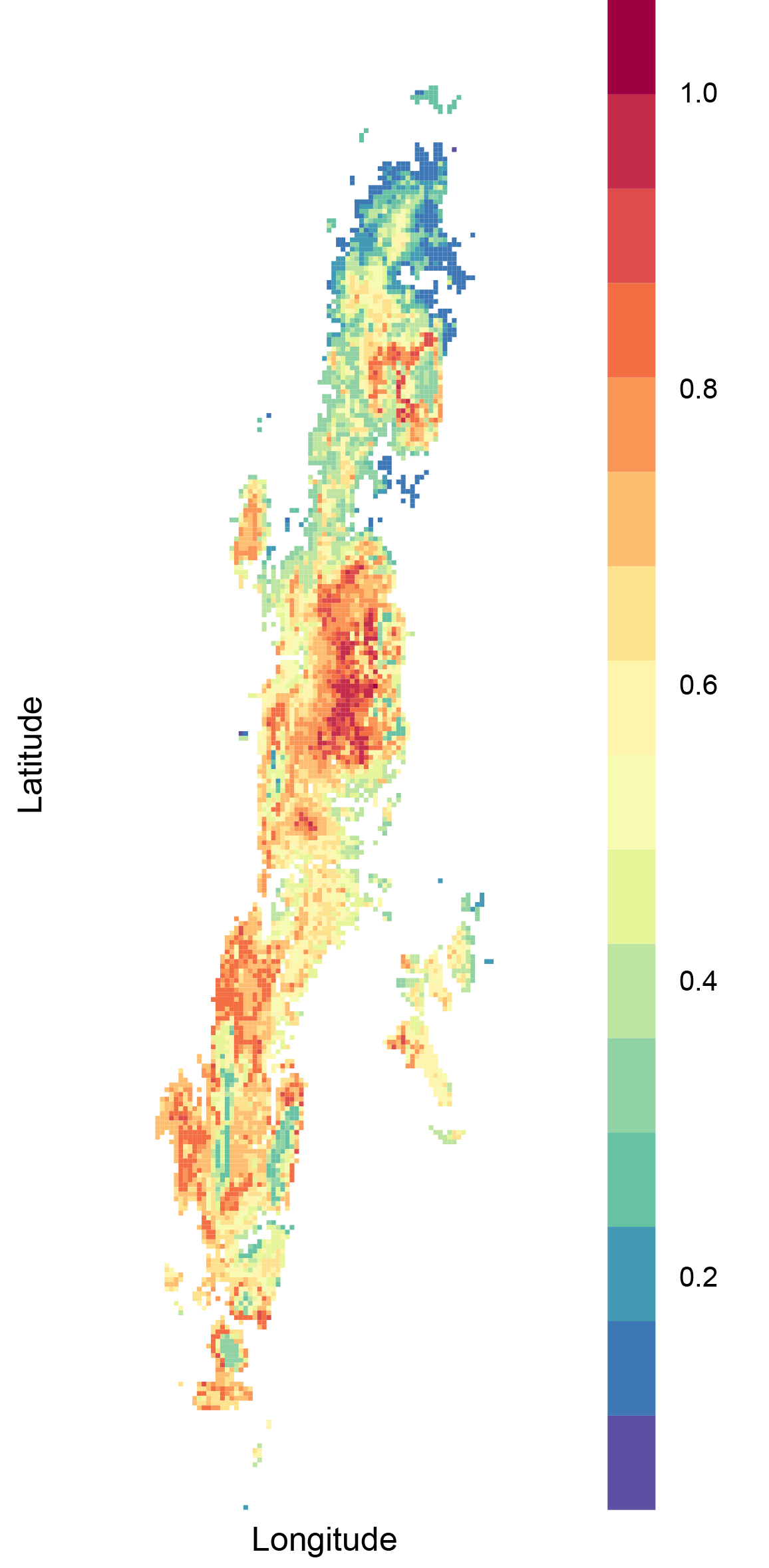 The lower prediction accuracy is likely due to a combination of factors: the species’ highly restricted distribution, small number of spatially independent occurrence points (n = 15), and potential microhabitat specificity that is not captured by coarse-scale bioclimatic variables. Rare or patchily distributed species often produce limited occurrence data, which reduces model reliability and increases uncertainty in predictions (Moudrý et al., 2024).