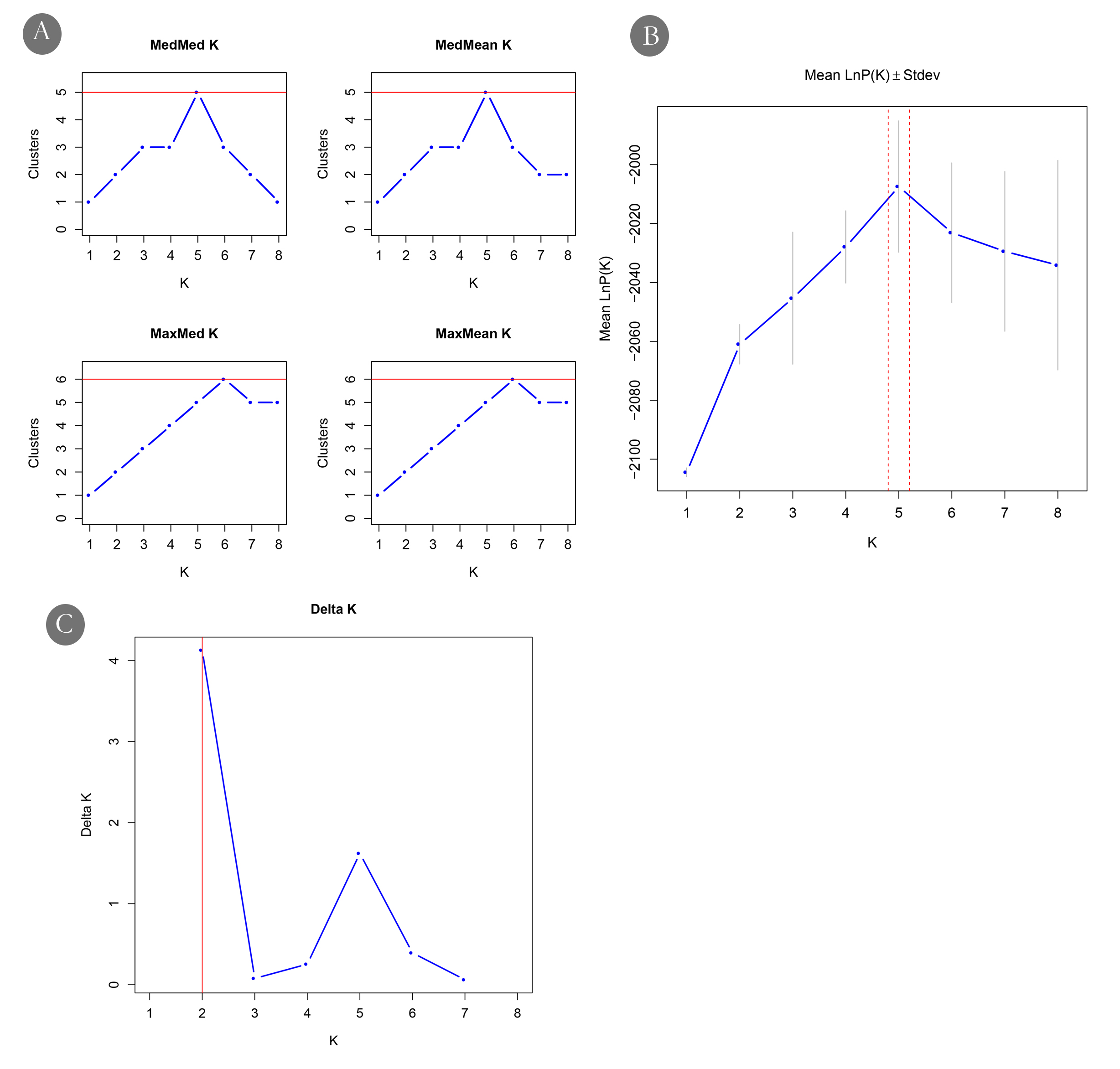 At higher K values (K = 5), supported by the mean log-likelihood (LnP(K)) and additional statistical estimators (MedMed, MaxMed, MaxMean), structure analysis revealed finer-scale population structure consistent with the geographic separation among populations. At K = 5, Radhanagar, Interview Island, Havelock, Bakultala, and Chidiyatapu populations exhibited distinct genetic structure with unique admixture patterns (Fig. 2). In contrast, the Baratang and Beetapur populations showed varying degrees of admixture from multiple clusters, suggesting shared ancestry with genetically distinct groups. This pattern of mixed ancestry is likely influenced by sample size or increased model complexity at higher K.