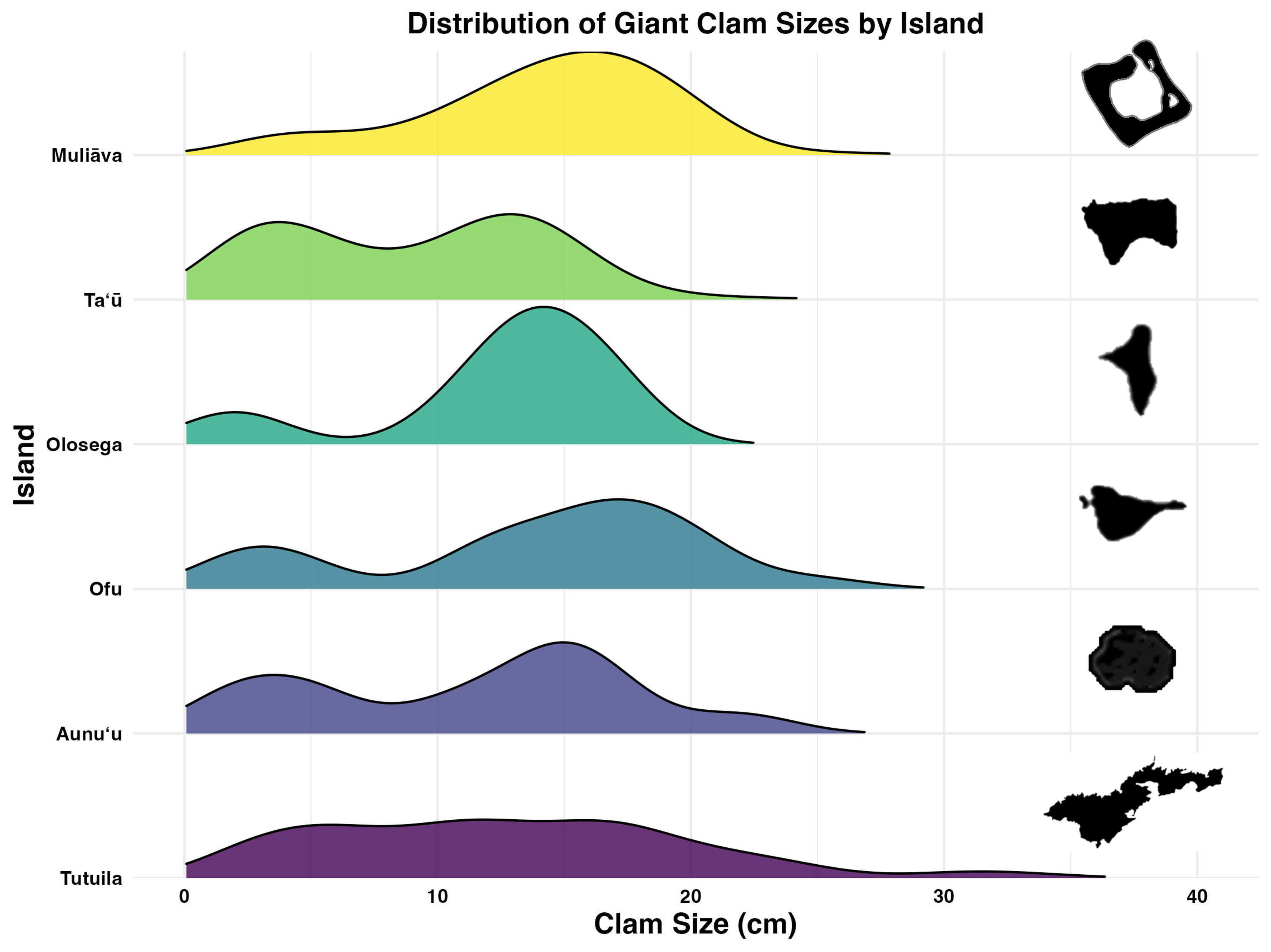 Figure 5: Live giant clam sizes of across islands in American Sāmoa found in 2022–2024 surveys.