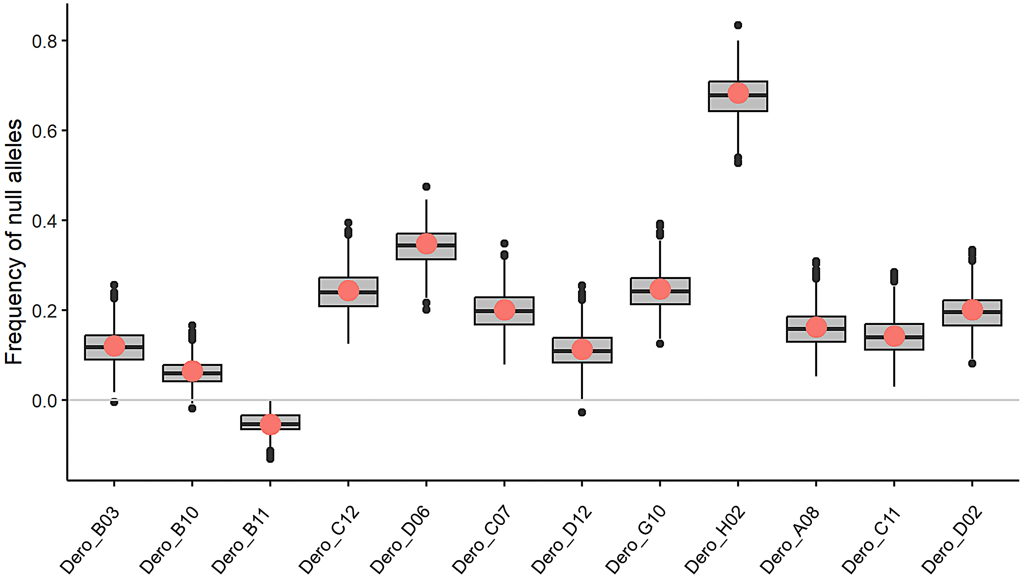 Estimated frequencies of null alleles at each of the 12 microsatellite loci for Desmodus rotundus. Null allele frequency was estimated using the Brookfield (1996) method in MicroChecker (Van Oosterhout et al., 2004) . Loci with null allele frequency >0.35 were eliminated from consideration (i.e., locus Dero_H02).