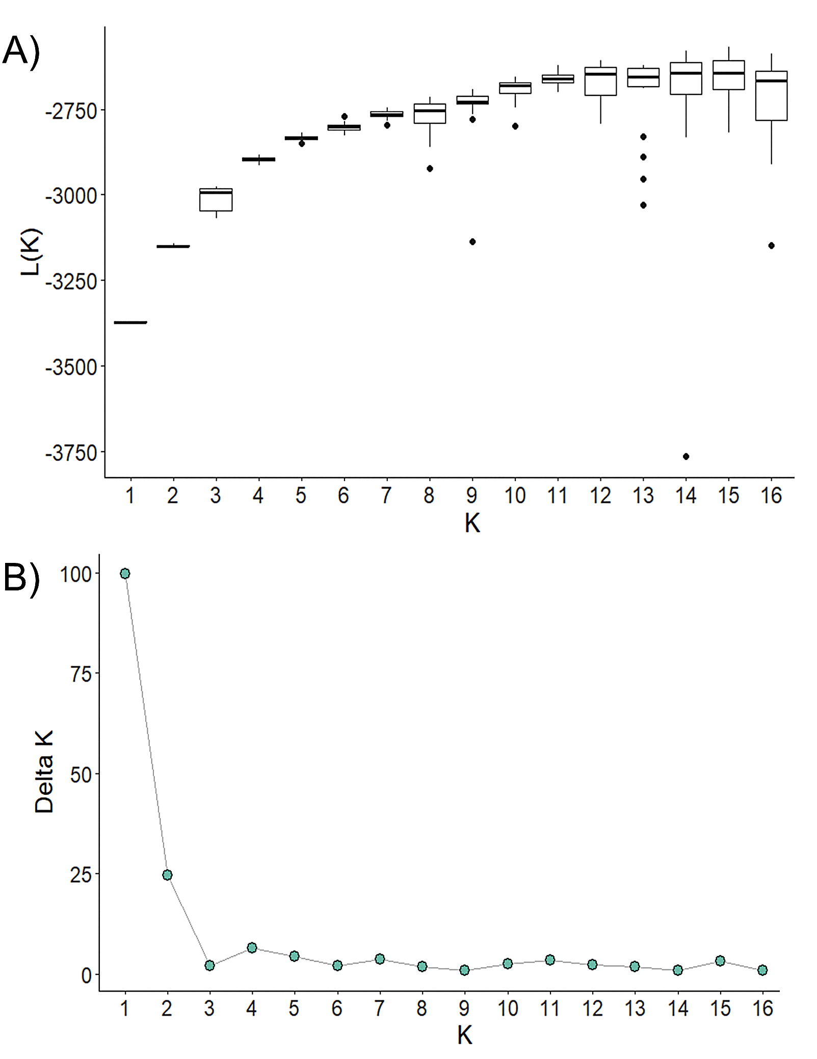 Analysis of STRUCTURE-based clusters (K) (Pritchard, Stephens & Donnelly, 2000) conducted using the delta K method of Evanno et al. (2005). A) Mean likelihood of each cluster from 20 replicate runs for each value of K. B) Delta K (mean absolute value of average likelihood over 20 runs divided by the standard deviation of mean likelihood) of each progressive number of clusters. Analysis of delta K was performed using STRUCTURE version 2.3.4 (Pritchard, Stephens & Donnelly, 2000).