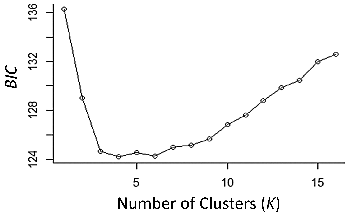 Bayesian information criterion (BIC) model selection criterion for progressive numbers of DAPC clusters (K) for identification of the best-supported number of clusters within our samples. We tested one to 15 clusters (three more than the number of sampling sites). Results indicate that three clusters of genetically similar individuals (i.e. populations) are most likely present within the data.