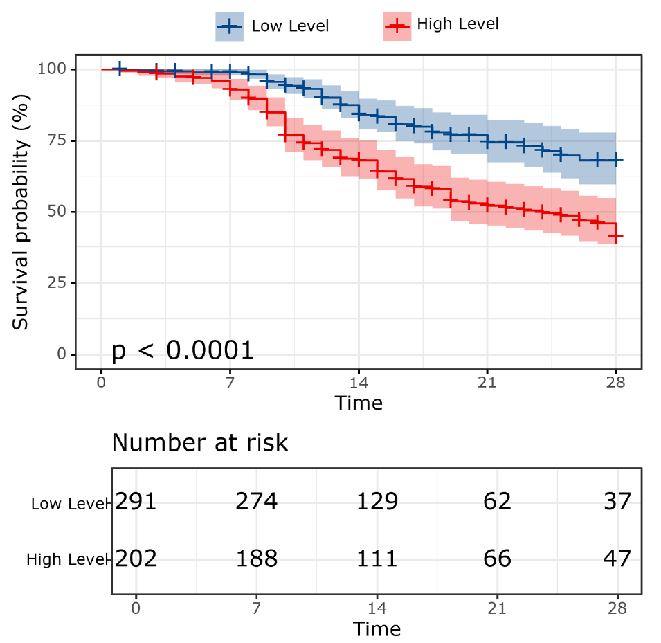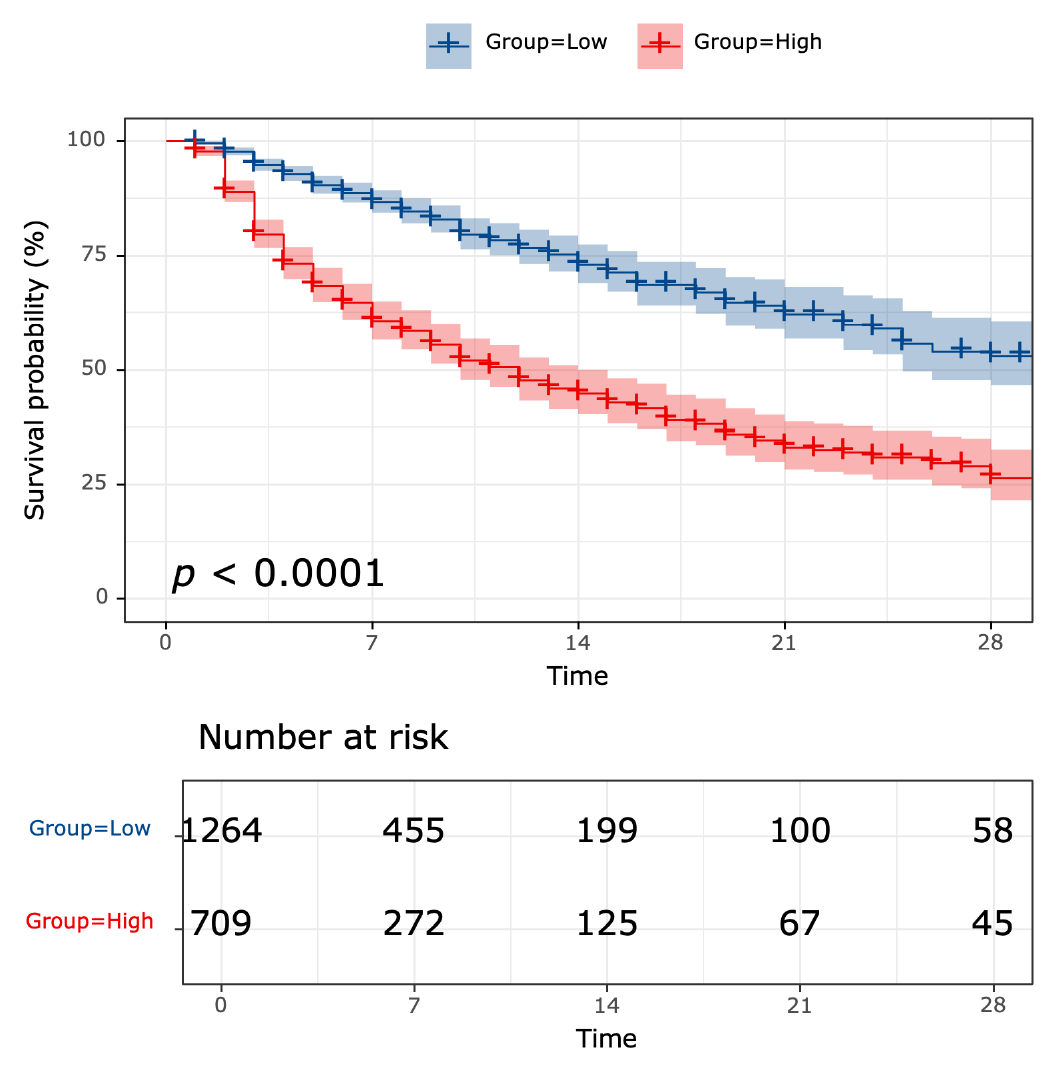 We further validated the predictive ability of GDF15-D1 for 28-day mortality in the validation cohort (n = 1,480). Logistic regression revealed that GDF15-D1 serves as a substantial prognostic factor for 28-day outcomes (odds ratio (OR) = 1.115, 95% CI [1.089–1.141]) (Table S4). The AUROC for GDF15-D1 in predicting 28-day mortality was 0.723 (95% CI [0.692–0.754]), not inferior to the APACHE II score (AUROC = 0.717, 95% CI [0.687–0.747]) (Fig. S2). Survival analysis of the combined cohort (n = 1,973) demonstrated significantly reduced 28-day survival probabilities in individuals with elevated GDF15-D1 levels (Fig. S3).