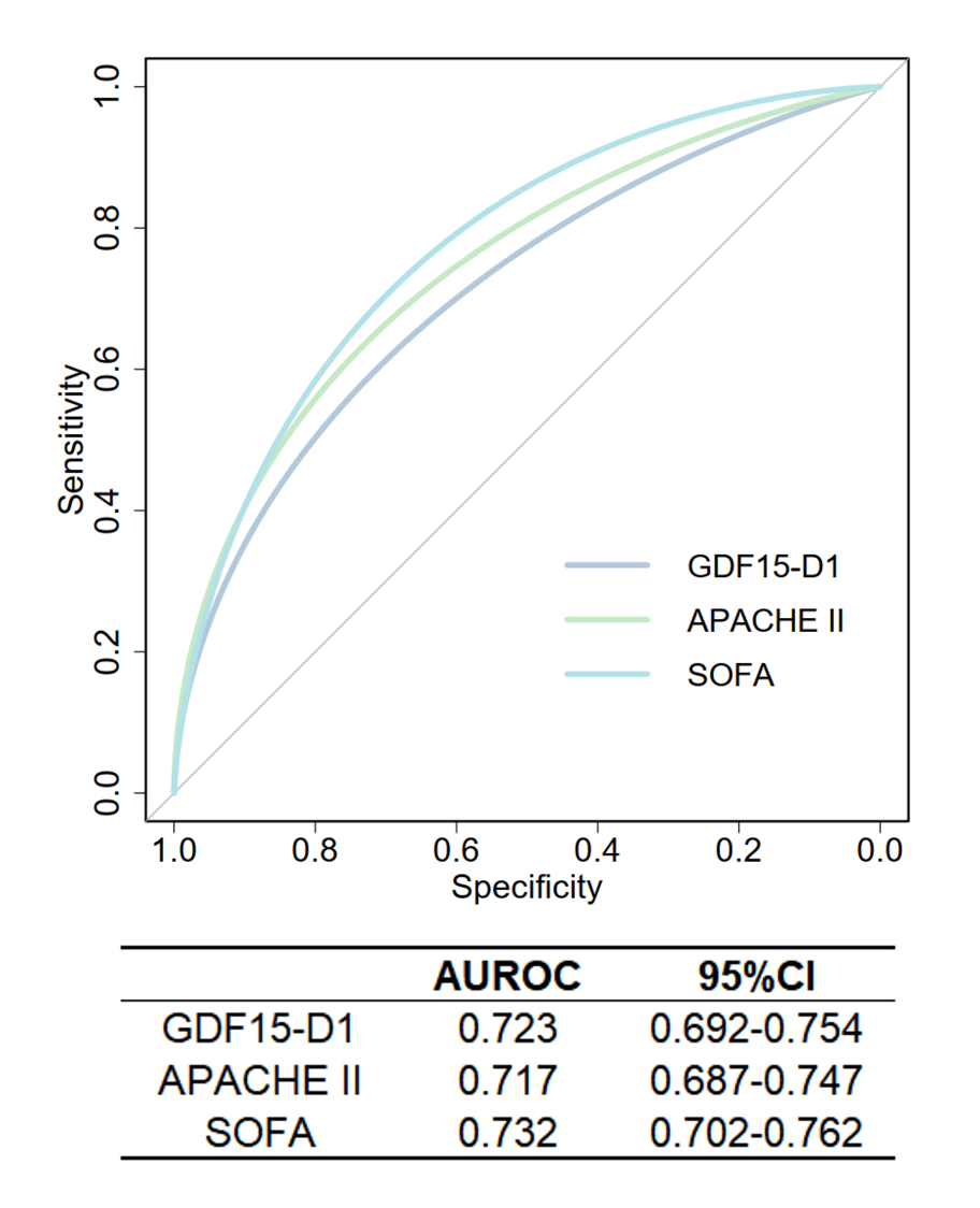 The APACHE score necessitates a 24-h evaluation period and requires a comprehensive collection of clinical data. Whether it is possible to obtain an initial assessment of prognosis upon ICU admission, which could guide treatment, facilitate communication, and establish realistic treatment goals, is also a challenge we aim to address in our study. At present, we have access to point-of-care testing equipment for GDF15, which utilizes fluorescence immunochromatography and can deliver serum GDF15 results within 15 min. Although still in the clinical trial phase, this technology enables rapid measurement at the bedside. Given this context, we further compared the initial GDF15 with the GDF15-load and observed a strong correlation. The initial GDF15 value demonstrated an AUROC for predicting 28-day mortality that was still not inferior to the APACHE score. Thus, we propose that the initial serum GDF15 level at ICU admission serves as a rapid, bedside prognostic biomarker that complements the APACHE score in critically ill patients.