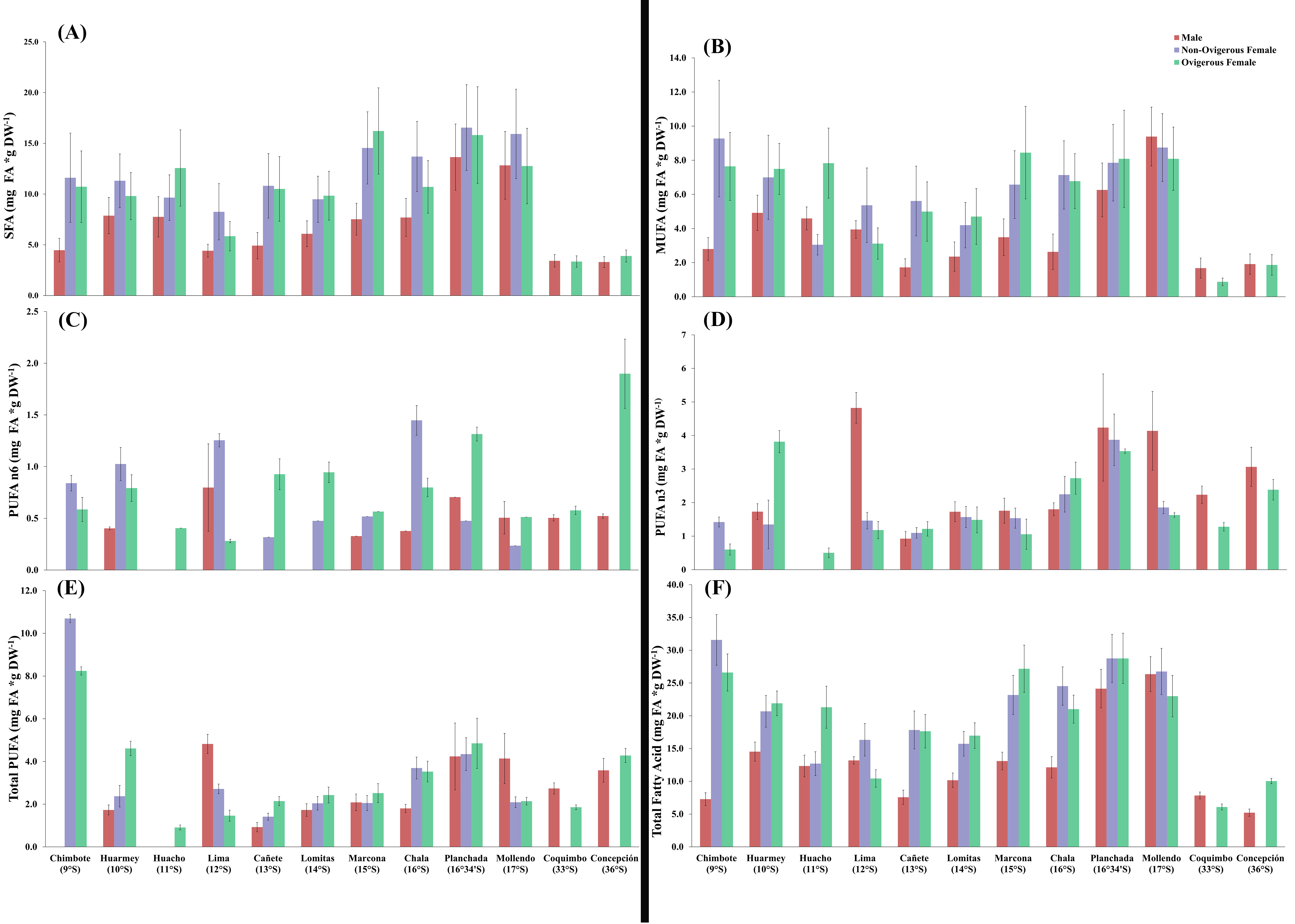 Along the latitudinal gradient, SP individuals captured in the localities of Marcona (15°S), Chala (16°S), Planchada (16°34′S), and Mollendo (17°S) presented the highest saturated fatty acid (SFA) contents. In turn, the monounsaturated fatty acids (MUFAs) decreased from furthest latitudes (09°S and 36°S) towards latitudes centrals in Perú such as Lima and Lomitas in the SEPO. Regarding the PUFA-n6, males presented trace amounts in the localities of Chimbote (09°S), Huacho (11°S), Cañete (13°S), and Lomitas (14°S), while females (ovigerous and non-ovigerous) showed a high content in the localities of Planchada (16° 34′S) and Mollendo (17°S). A notable increase in the PUFA-n3 content was observed from 09°S LAT towards 17°S LAT in the Peruvian SEPO, with a greater abundance in the Planchada locality. While the Mollendo locality presented a low content of PUFA-n3 in females (ovigerous and non-ovigerous), and an absence of these FAs in the Huacho (11°S) (males and non-ovigerous females) and Chimbote localities (09°S) (males) (Fig. S1, Tables 3–5).