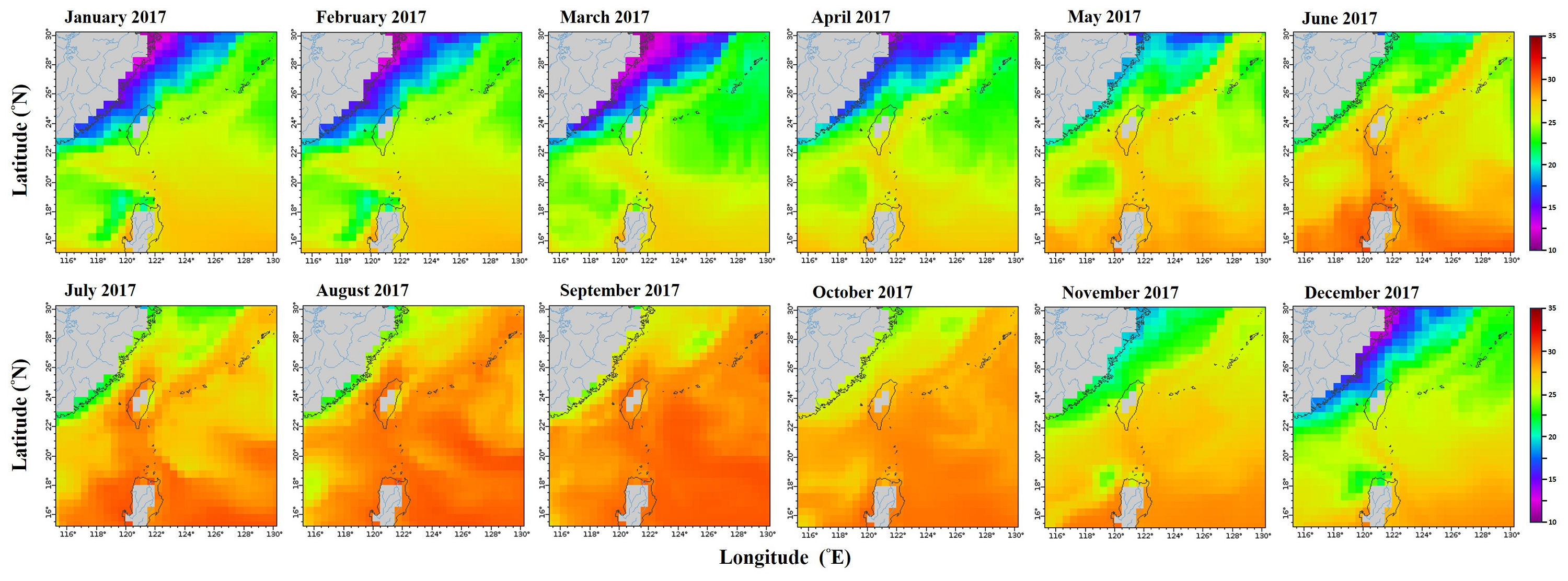 Monthly mean sea surface temperature in the northwestern Pacific from January to December 2017.
