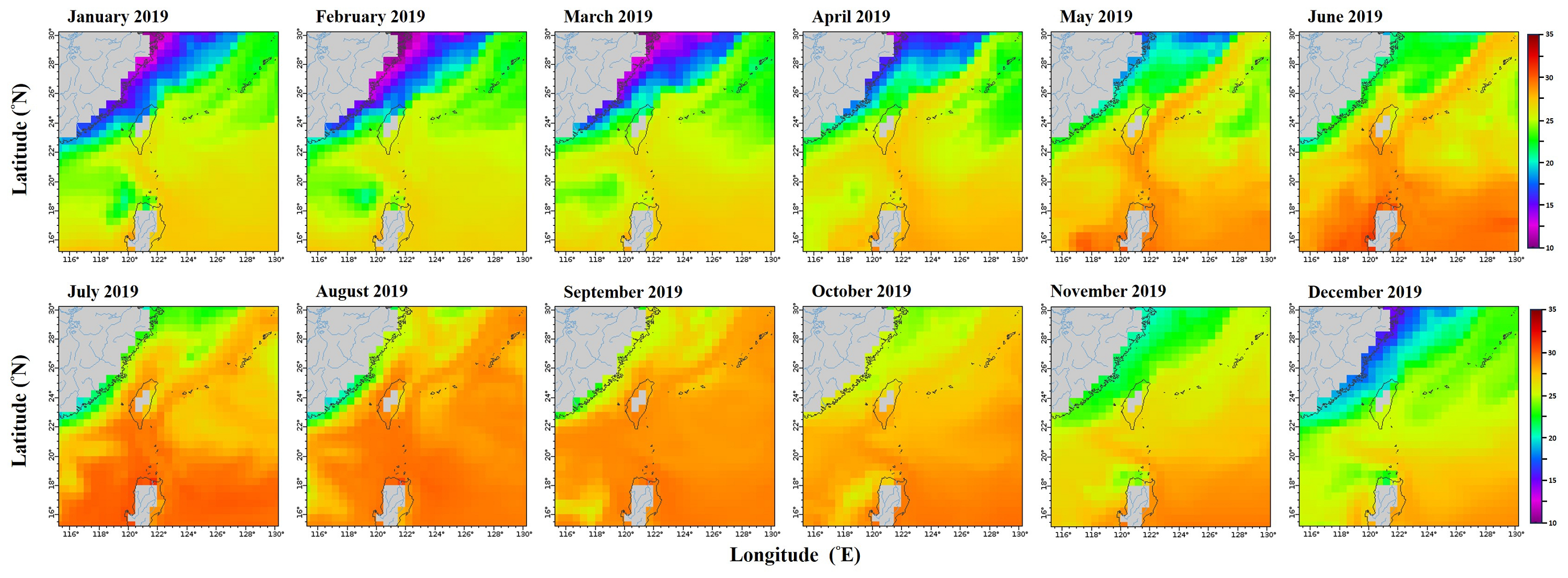 Monthly mean sea surface temperature in the northwestern Pacific from January to December 2019.